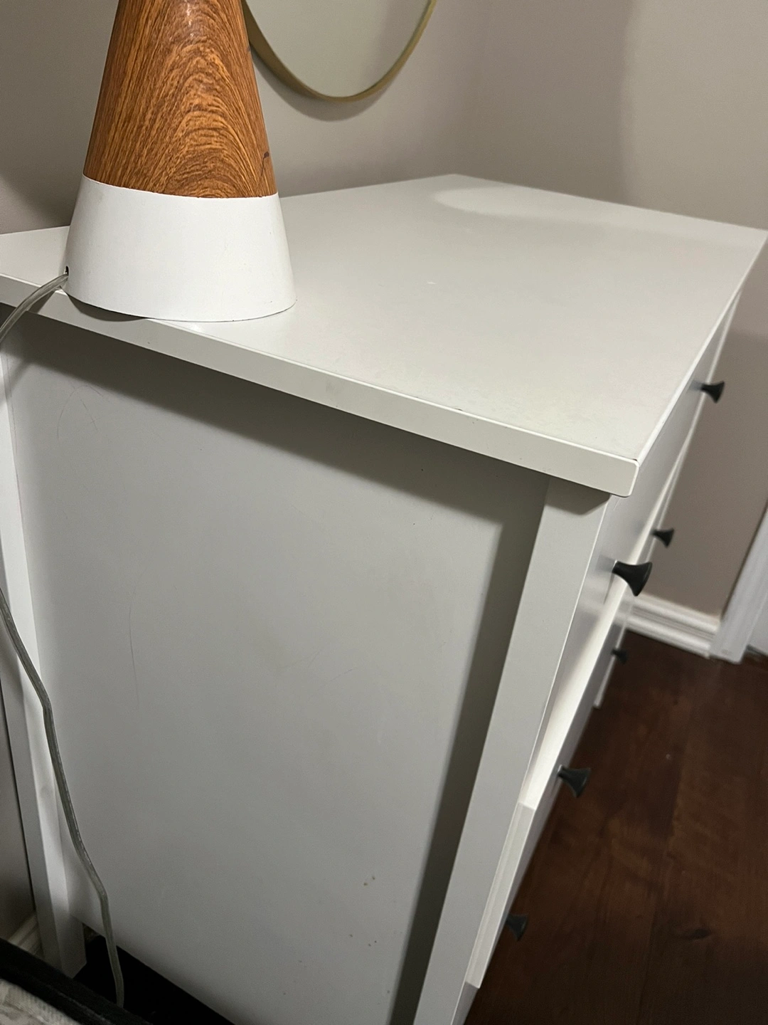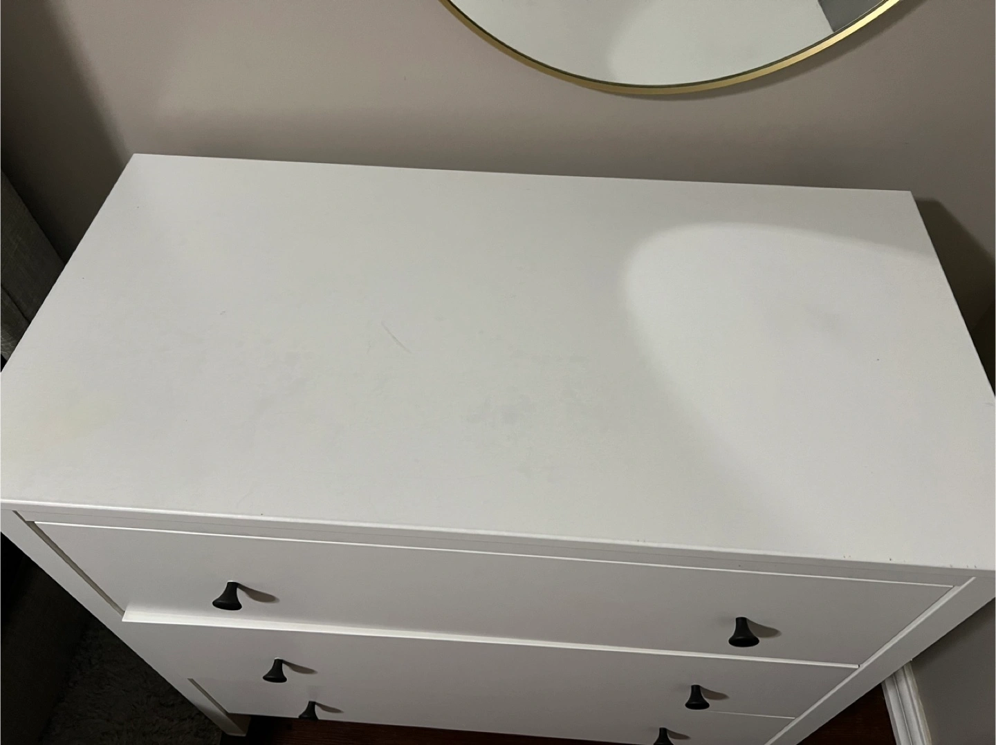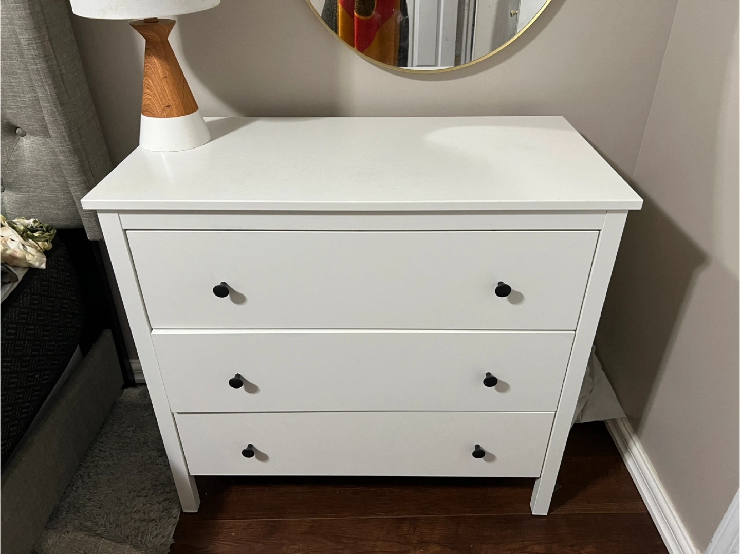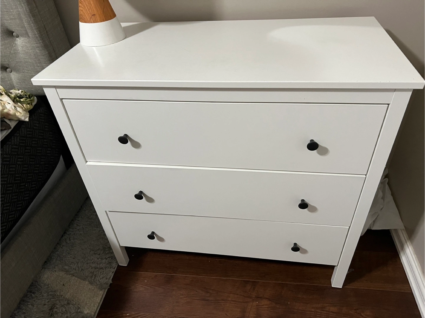 10a gently 2piece of used IKEA Hemnes 3-drawer dresser in white. It's in great shape and perfect for a bedroom or any space needing extra storage. The dresser has a classic look with black handles that fits well with many decor styles. It's a sturdy and reliable piece of furniture from IKEA.