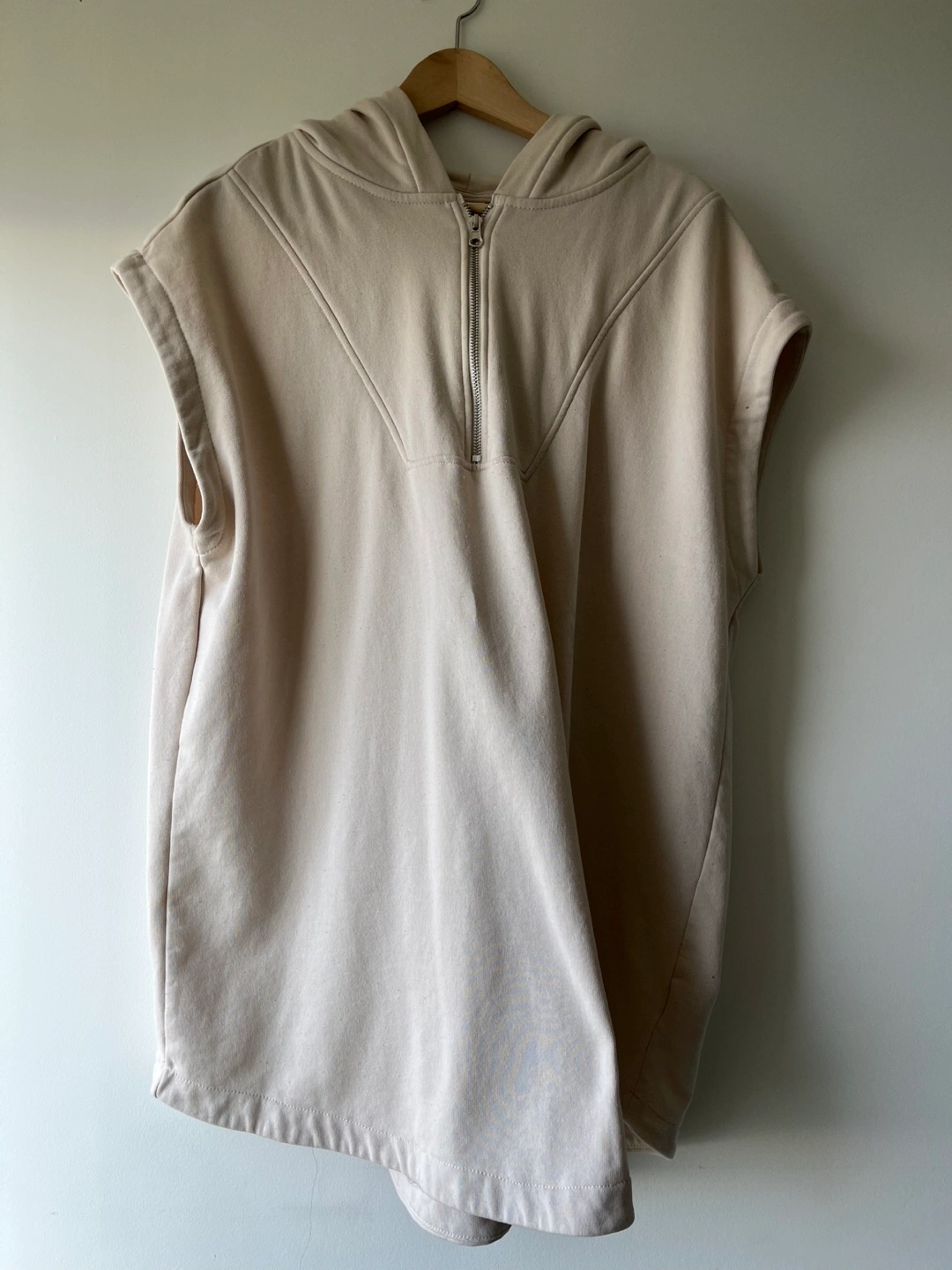 Selling a comfy beige hooded sleeveless dress! It's in great condition and would be perfect for layering or wearing on its own during warmer weather. The neutral colour makes it super versatile to pair with anything!