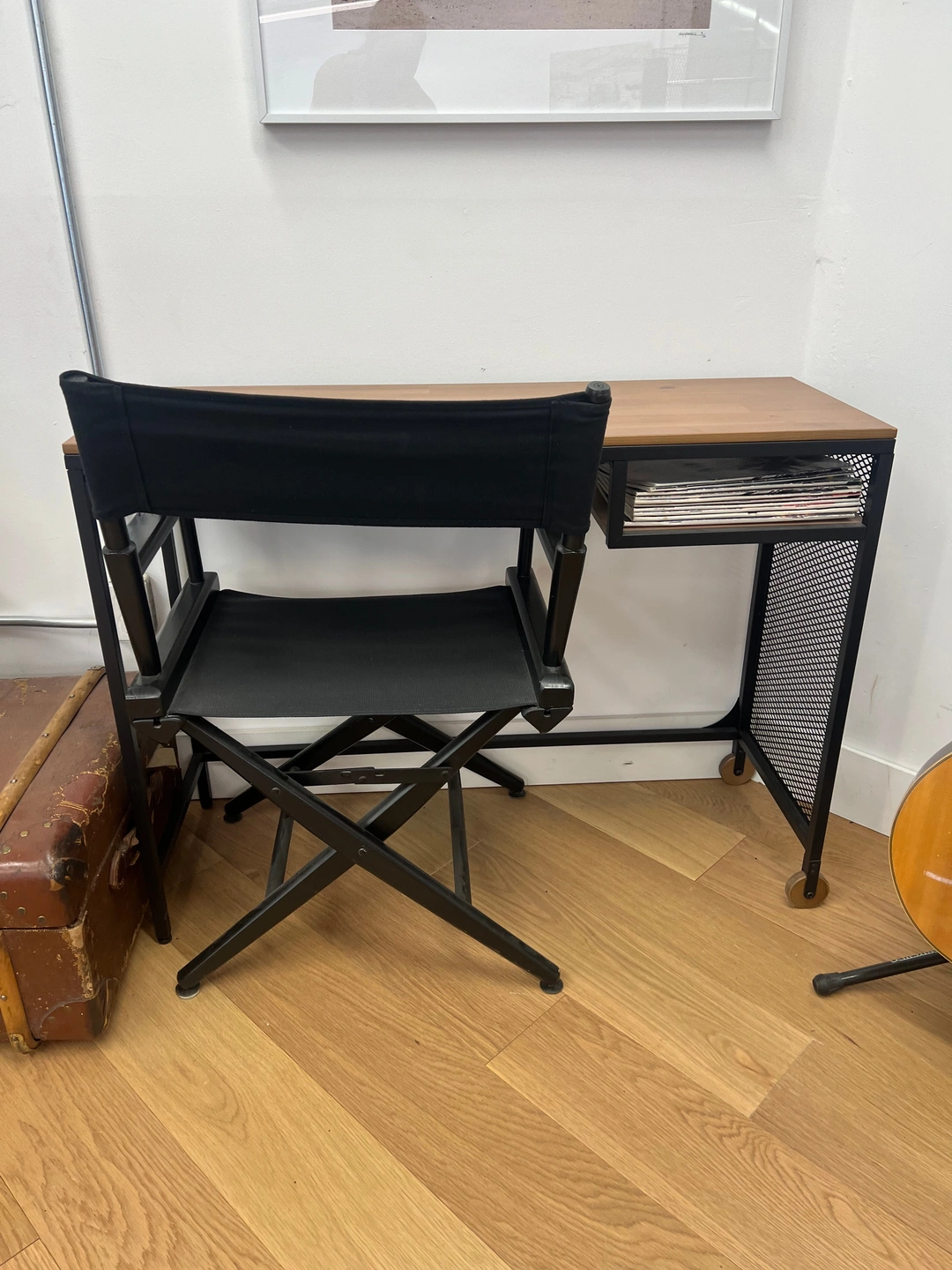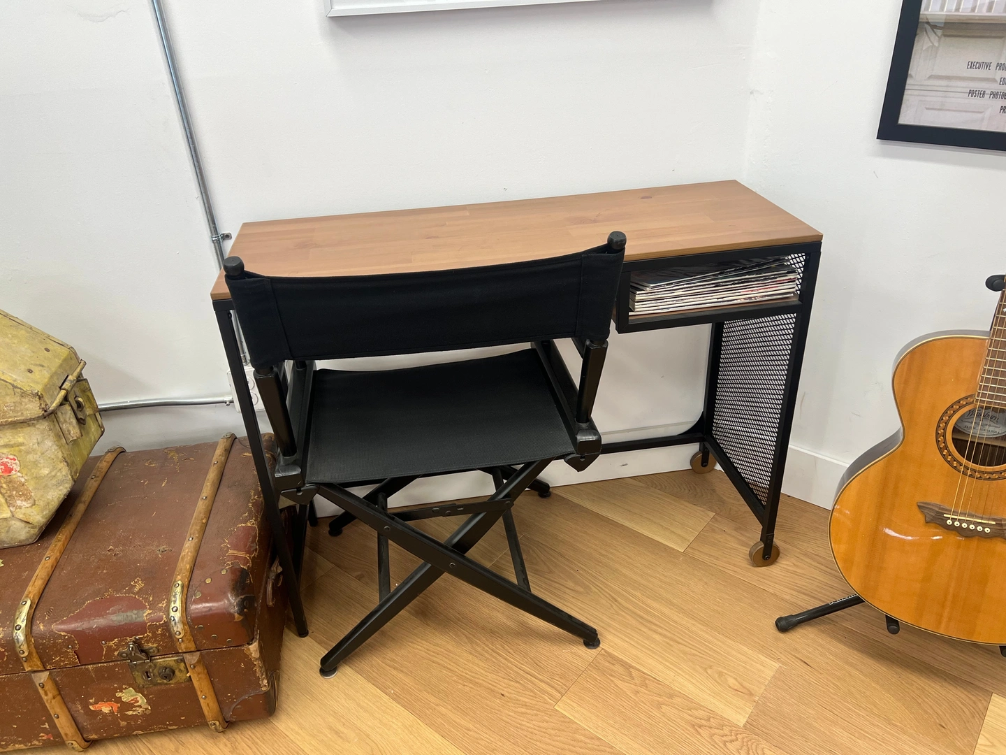 Lightweight IKEA desk with a stylish wood top and black "wrought-iron look" for the legs. The desk also has a small, built-in shelf. It is in great condition.