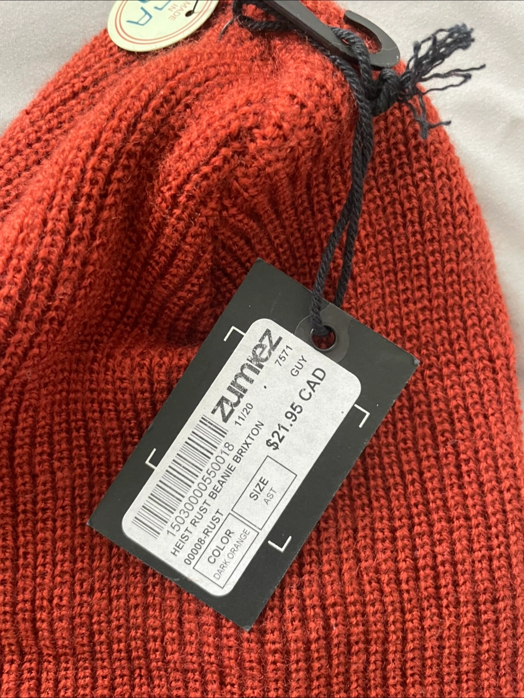 Cozy Zumiez Heist Rust Beanie in a stylish dark orange colour! The tag shows it was originally $21.95 CAD. A great way to keep your head warm and add a pop of colour to your outfit!