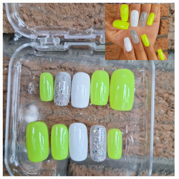 Selling a set of press-on nails in a fun mix of neon green, white, and glitter! These are perfect for adding a pop of colour to your look. Comes in a clear plastic case for easy storage and application.
