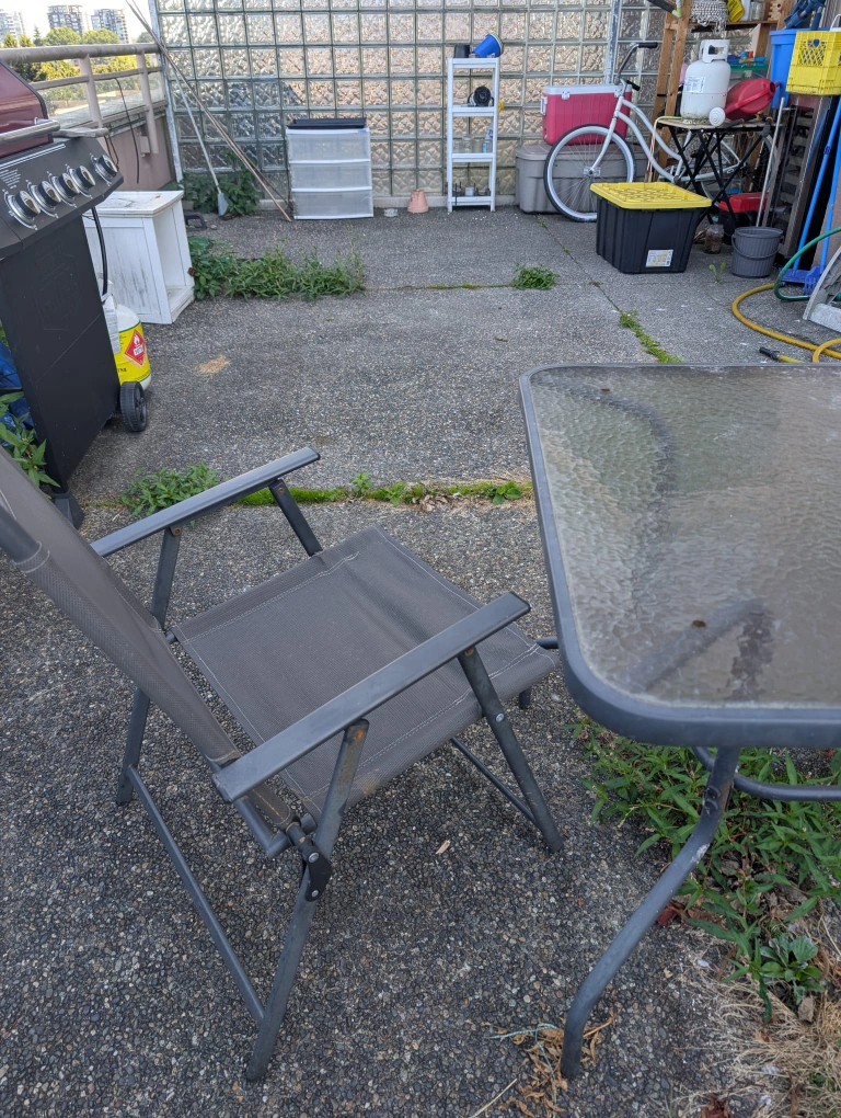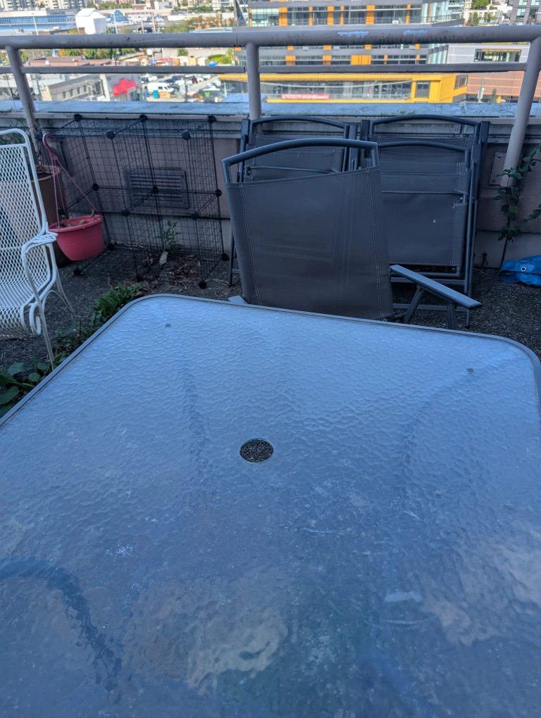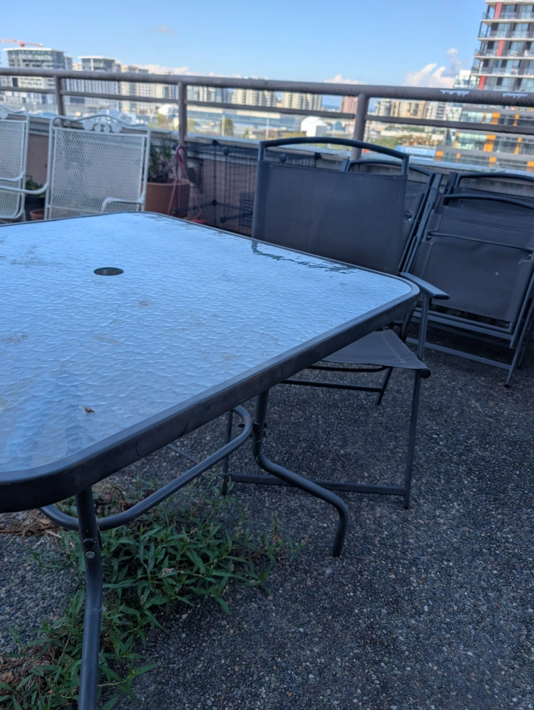 Selling a used outdoor glass table with 4 folding chairs. It's perfect for a balcony or patio. The set shows some signs of wear and tear, but is still functional and ready for use. Ideal for enjoying those summer evenings! Moving sale. Last days. Make an offer.