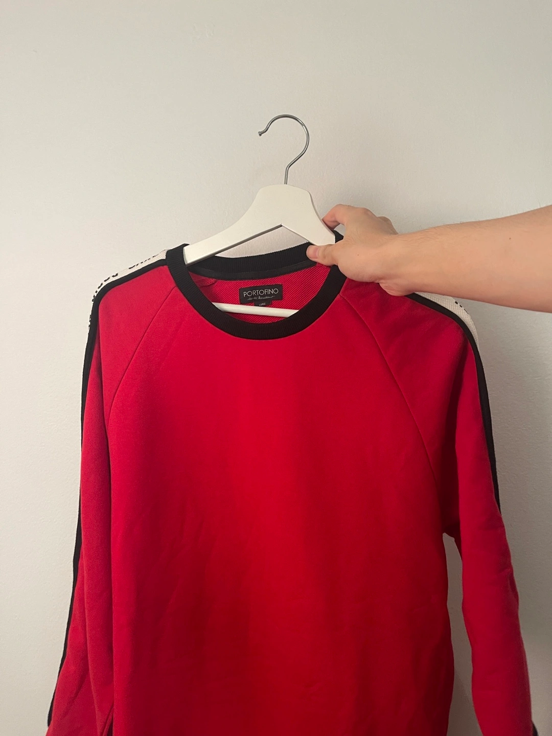 106Selling a red Portofino sweatshirt. It features a black neckline and a stripe down the side with 'New York London Tokyo' printed on it. Size is small. Only worn a handful of times. Super trendy but just not my style anymore.