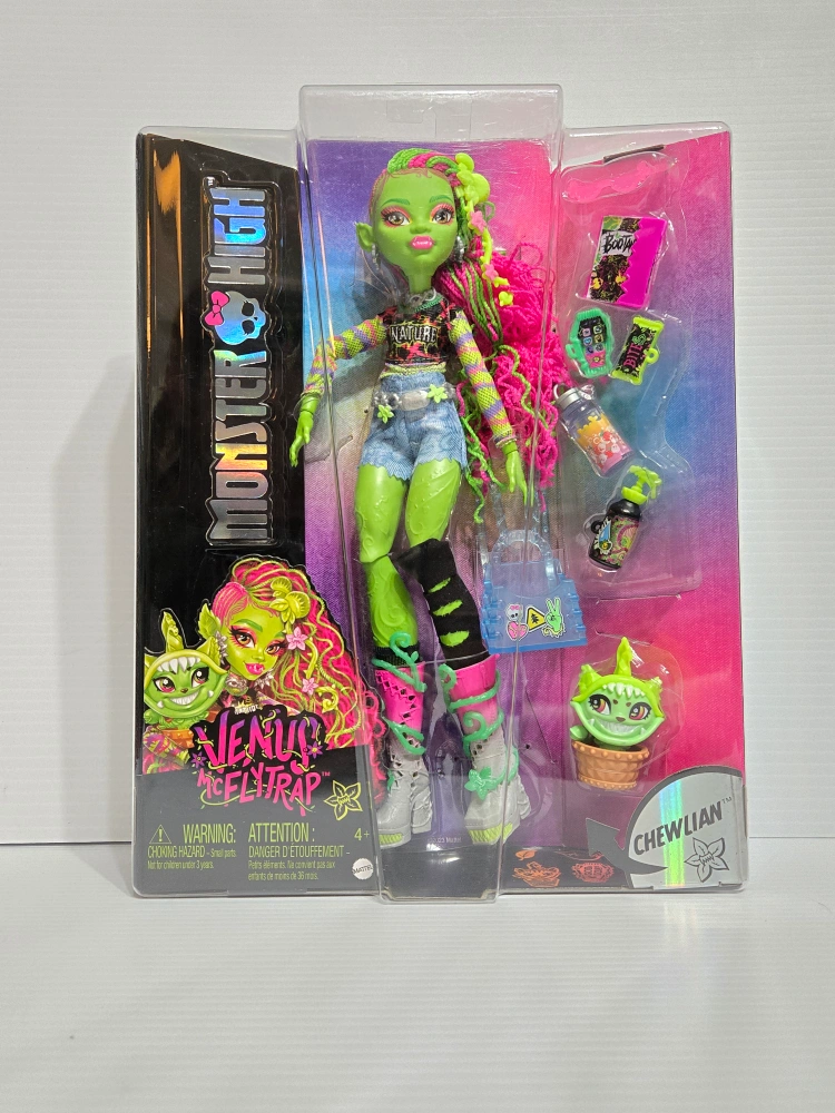 Selling a Monster High Venus McFlytrap doll! This doll is super cool with her bright green skin, pink and green hair, and unique fashion. She comes with lots of fun accessories, including her pet Chewlian. The doll is in great condition and comes in its original box, perfect for collectors or kids who love Monster High!