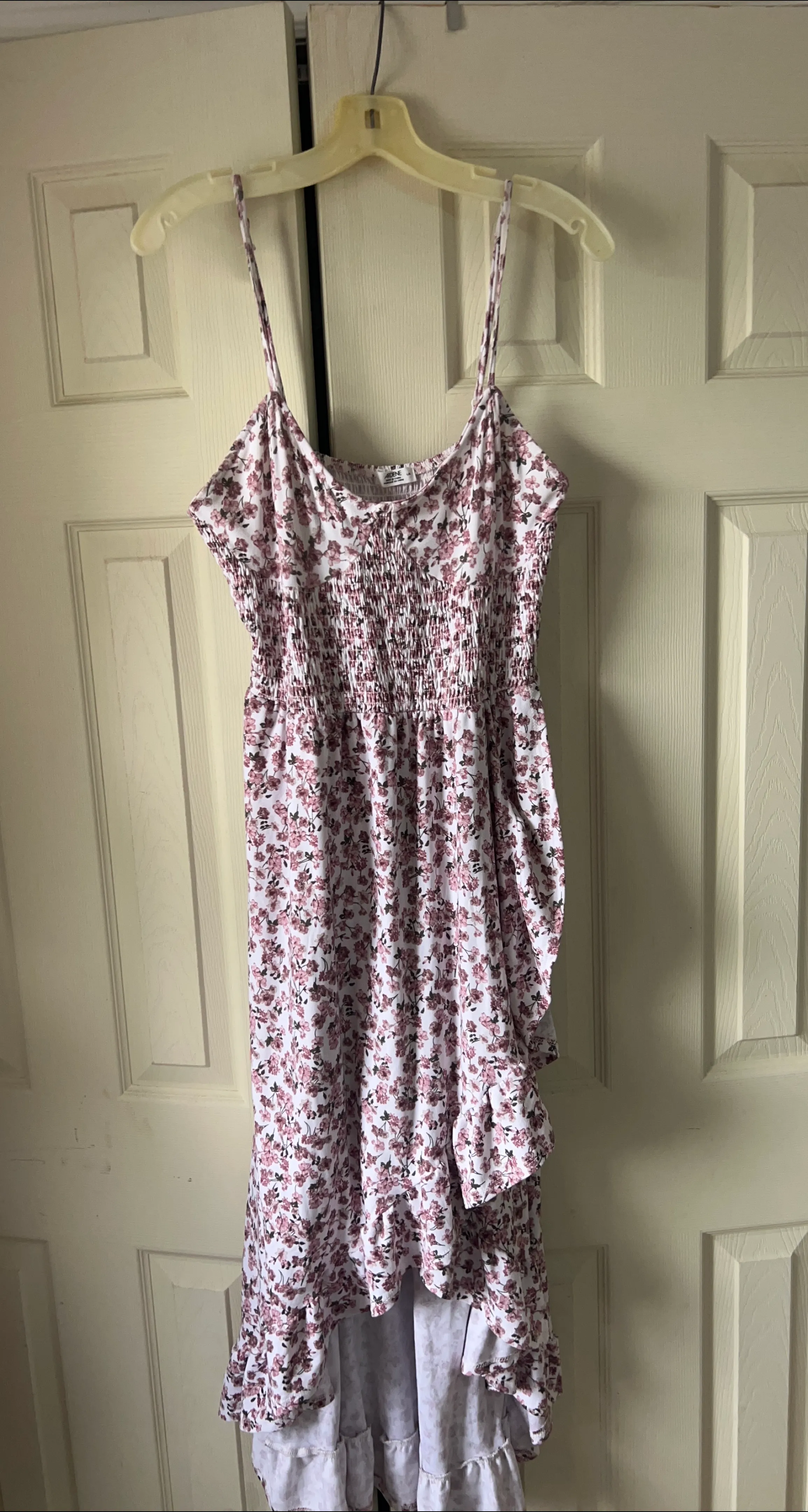 Selling a cute floral sundress! It's a size large and perfect for summer days. The dress has a smocked bodice and a high-low hem. It's in great condition and ready for a new home!