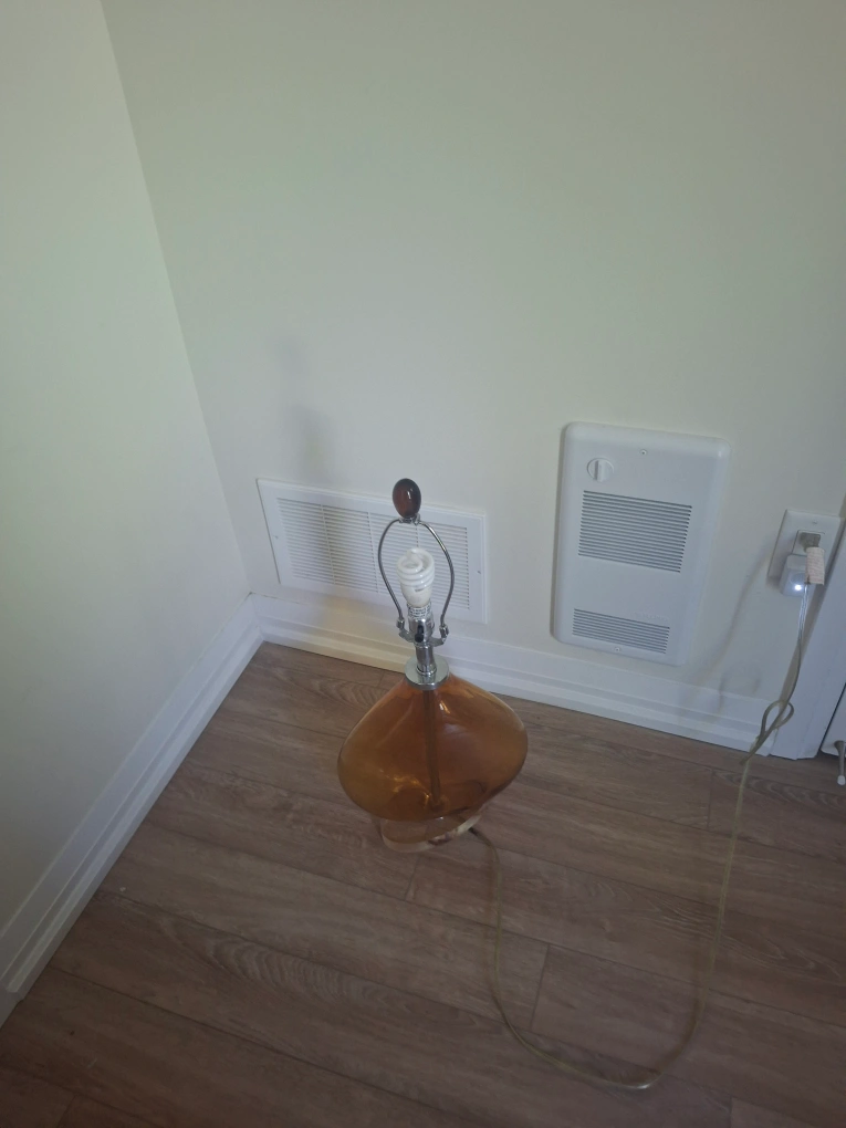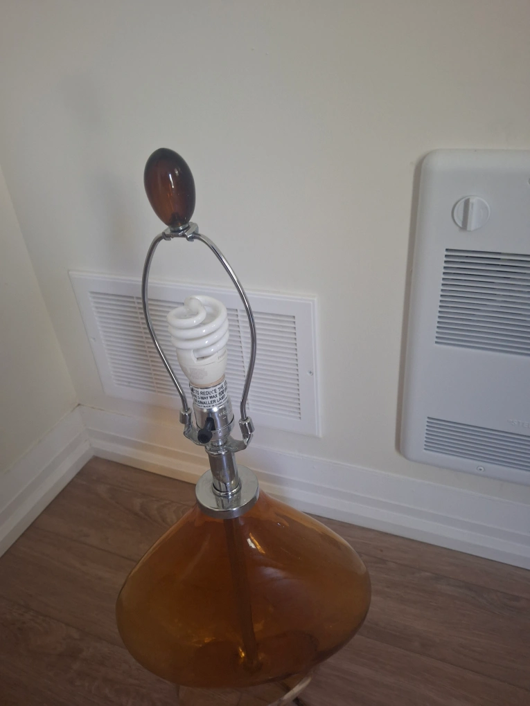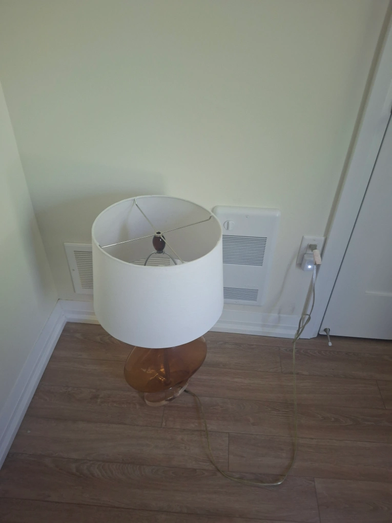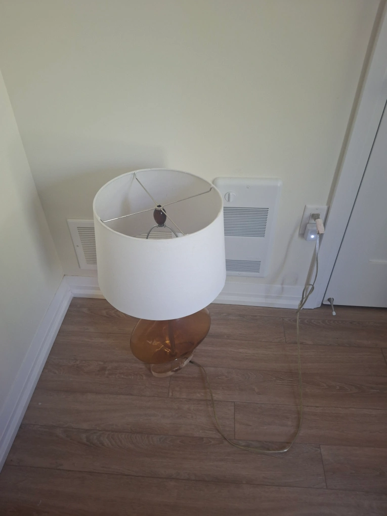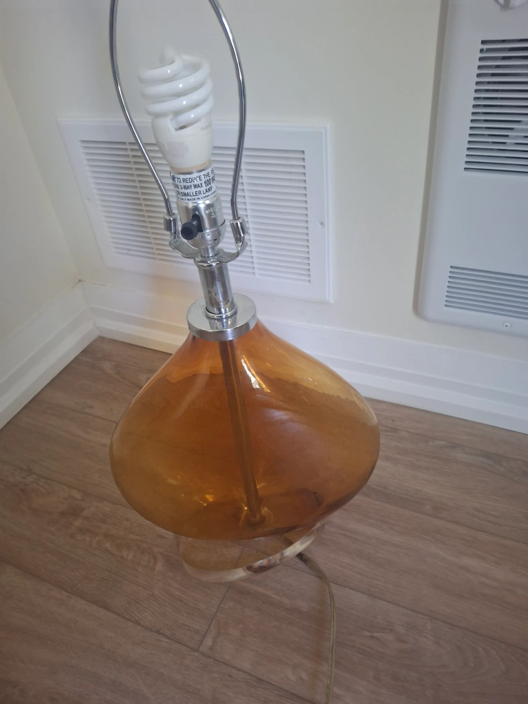 Here's a stylish amber glass table lamp that would look great in any room. It comes with a white lampshade. The lamp is in good condition and ready to brighten up your space!