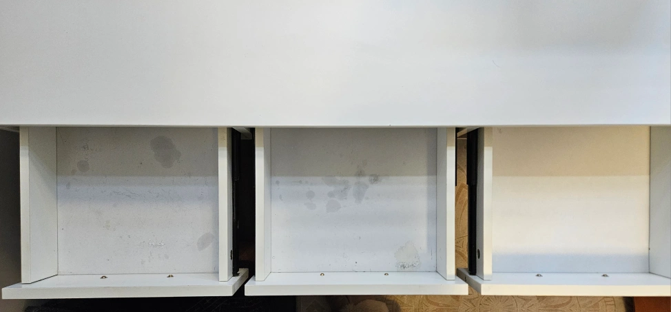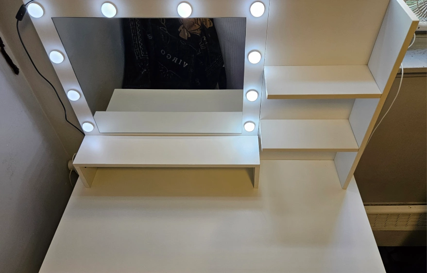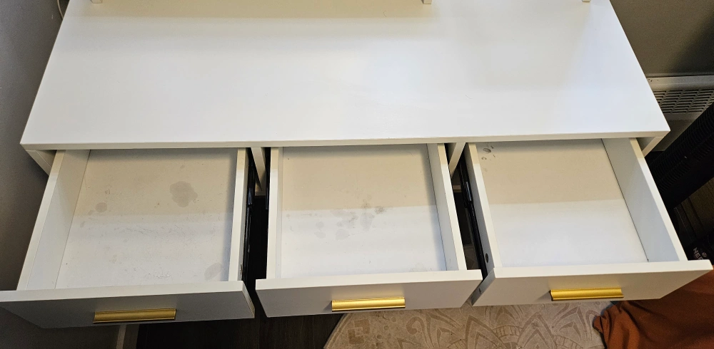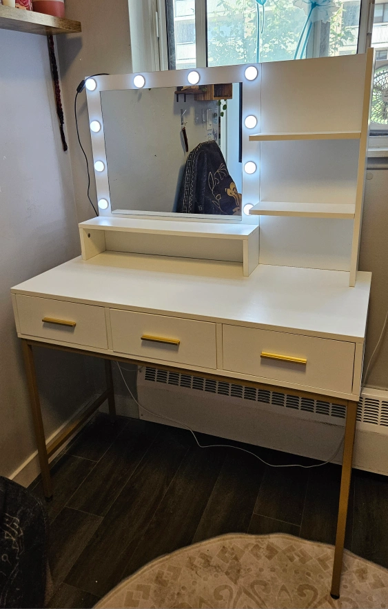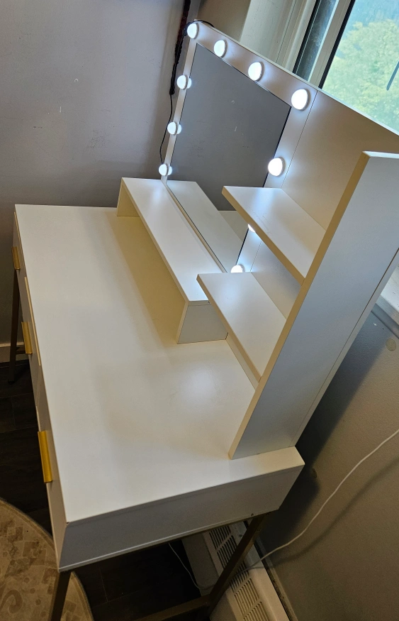 Selling a vanity table with a lighted mirror. It features a sleek design with a white finish and gold accents. There are some stains and scratches inside the drawers.