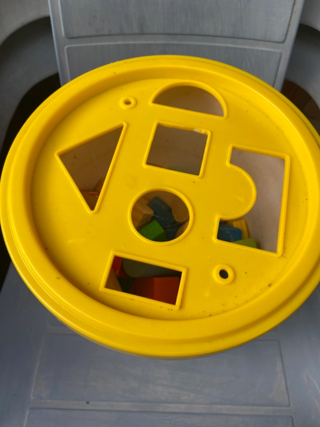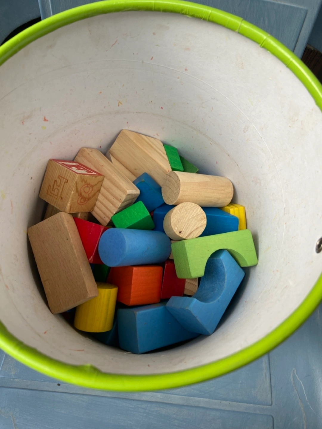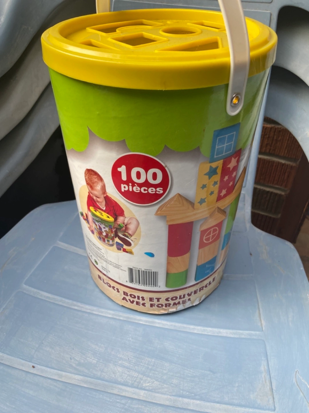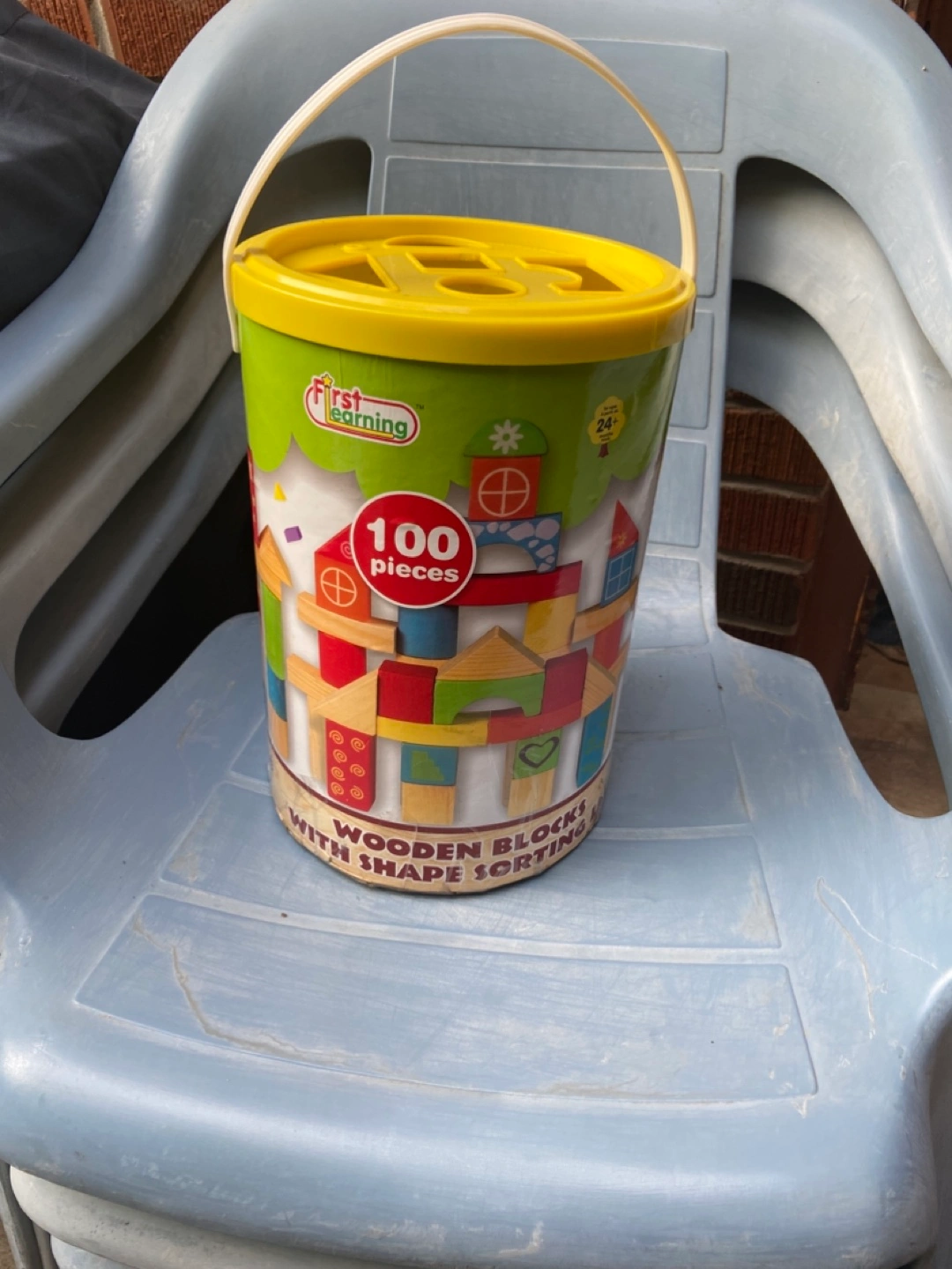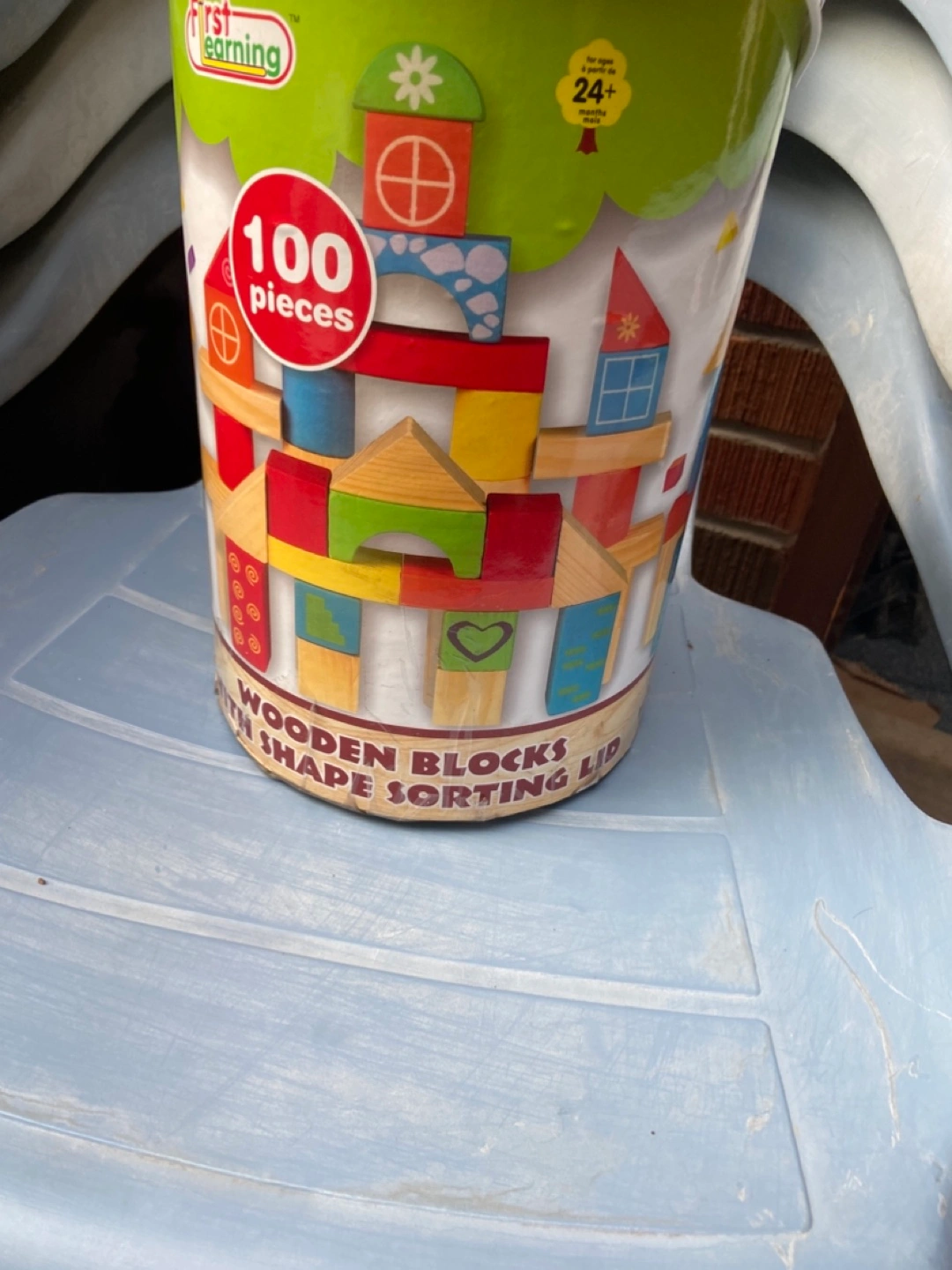 Wooden blocks with shape sorting lid from First Learning! This set comes with 100 pieces and is recommended for ages 24+ months. Great for developing fine motor skills and shape recognition it’s mix and match few pieces may b missing