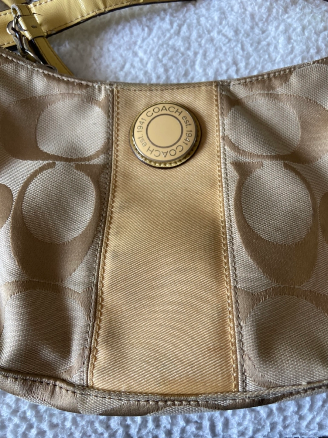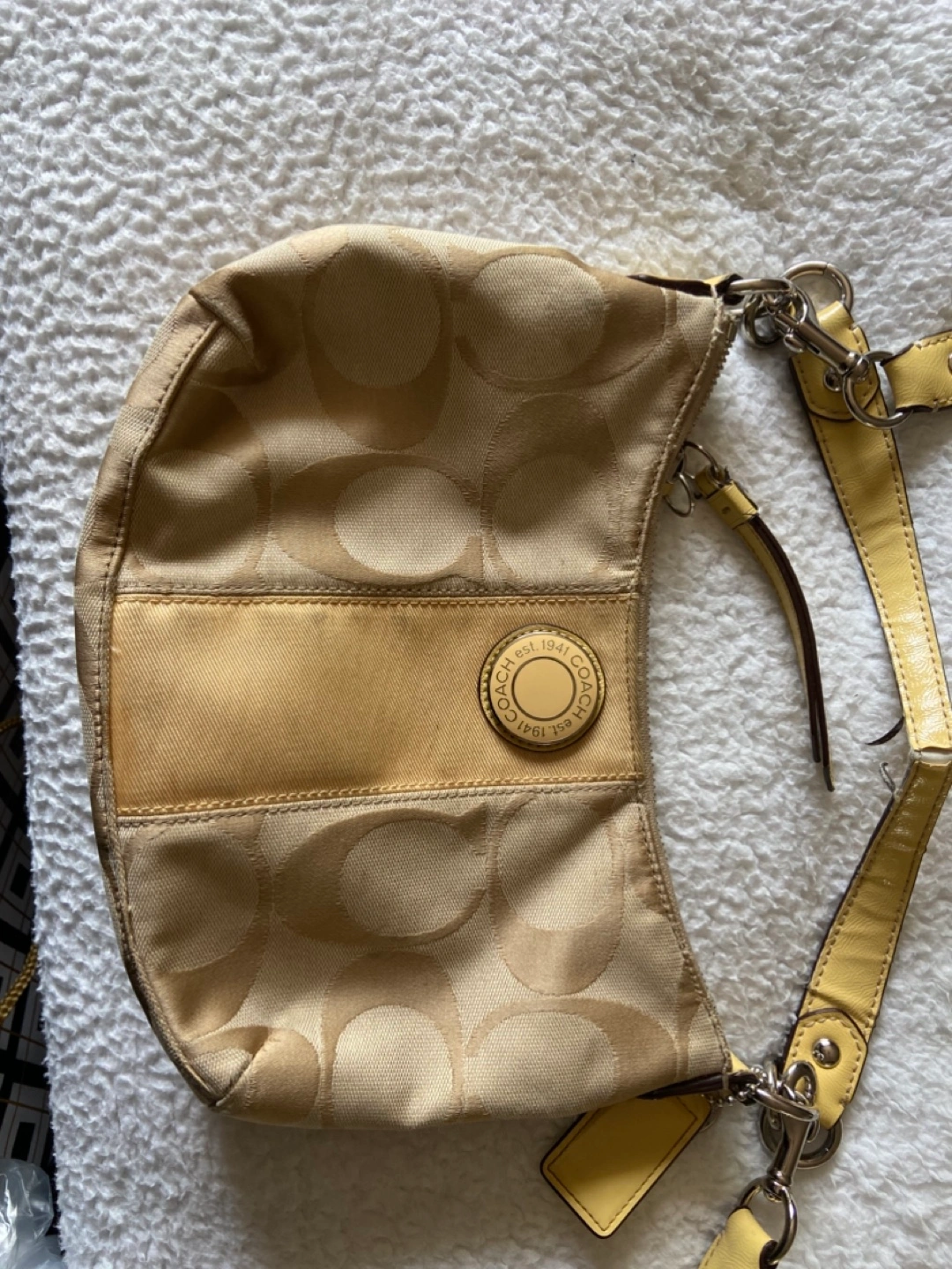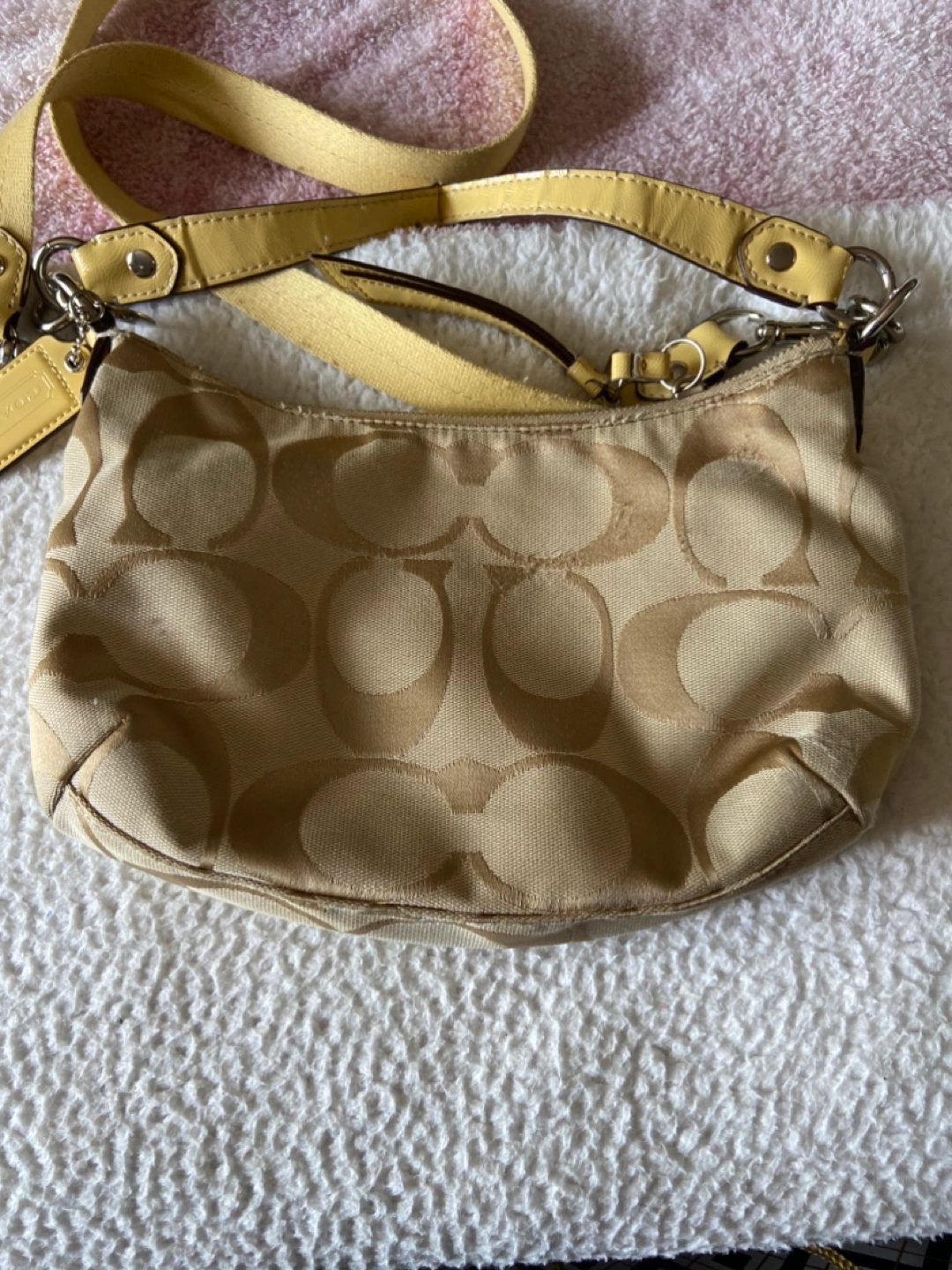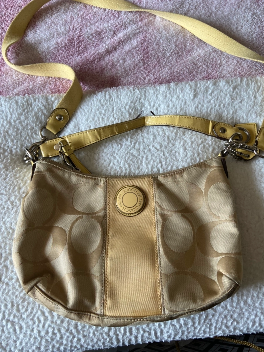 Selling a Coach hobo bag. It has a light yellow strap and the classic Coach logo design. It's in good used condition and ready for a new home! Straps are little worn need little cleaning