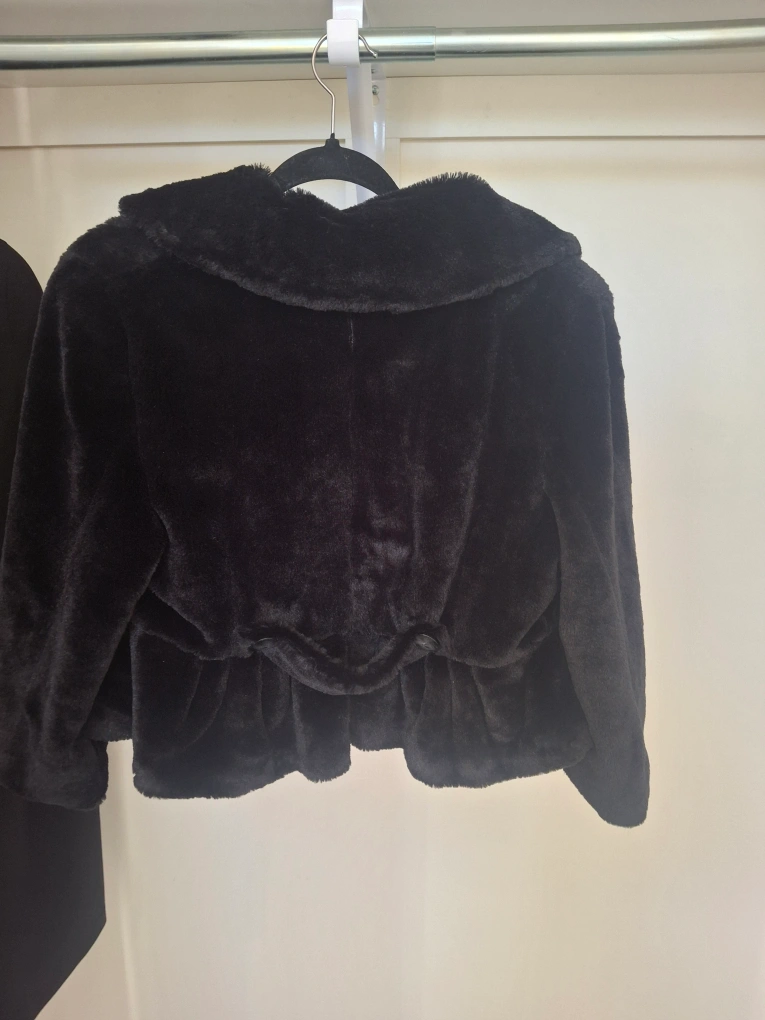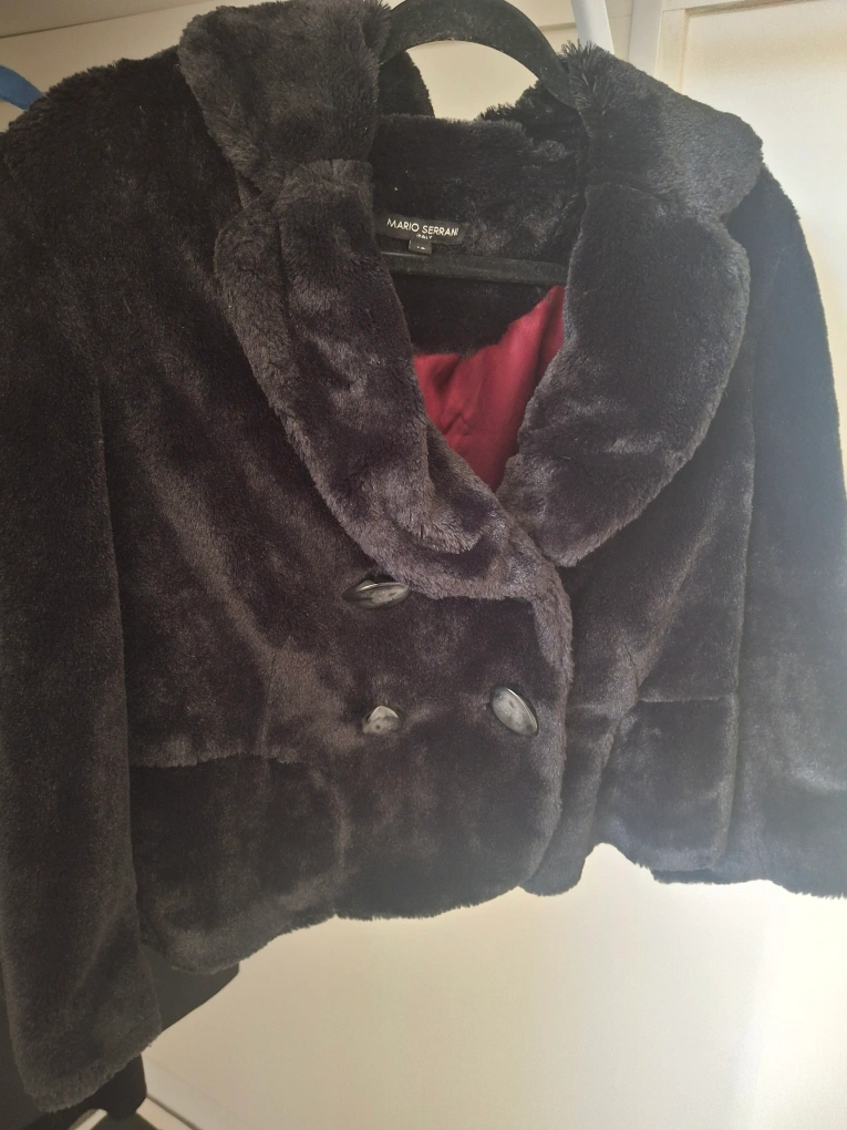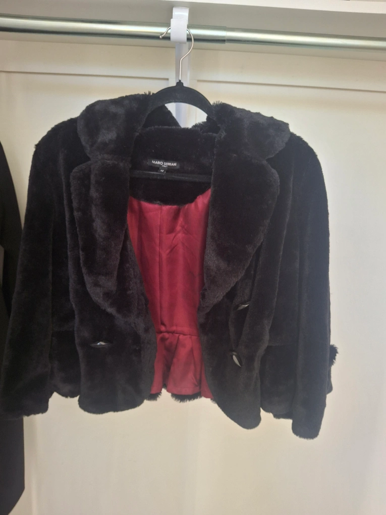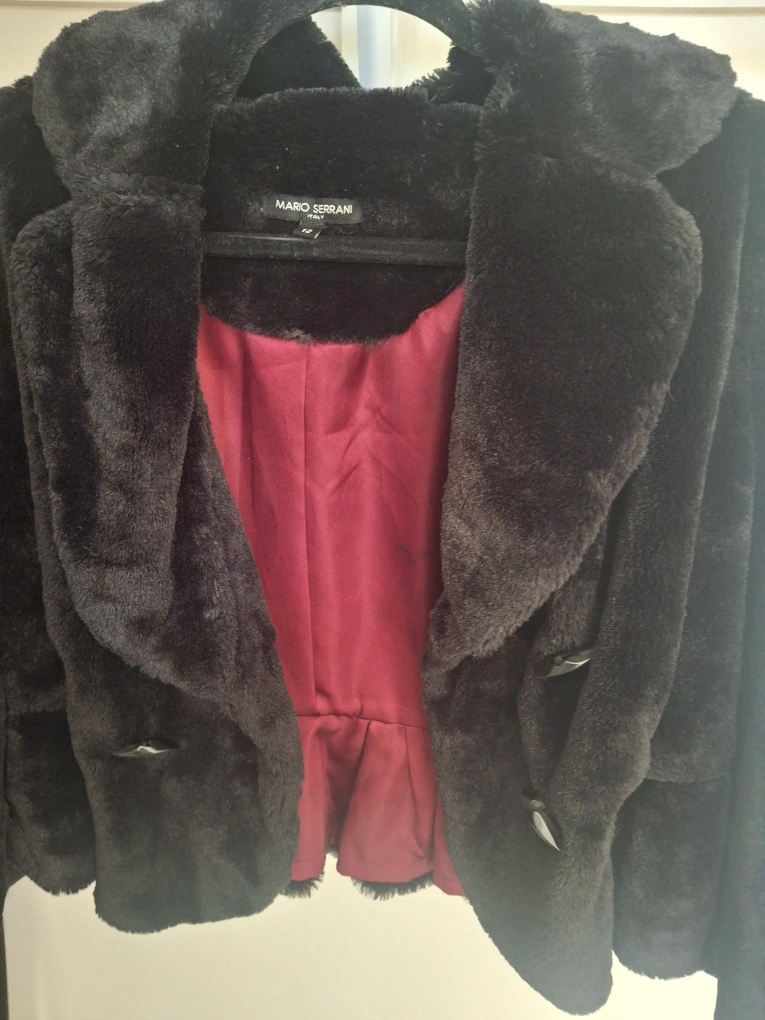 Cozy up in this stylish black faux fur jacket from Mario Serrani! It's perfect for adding a touch of elegance to any outfit. The jacket is in great condition and features a flattering cut with a red lining.