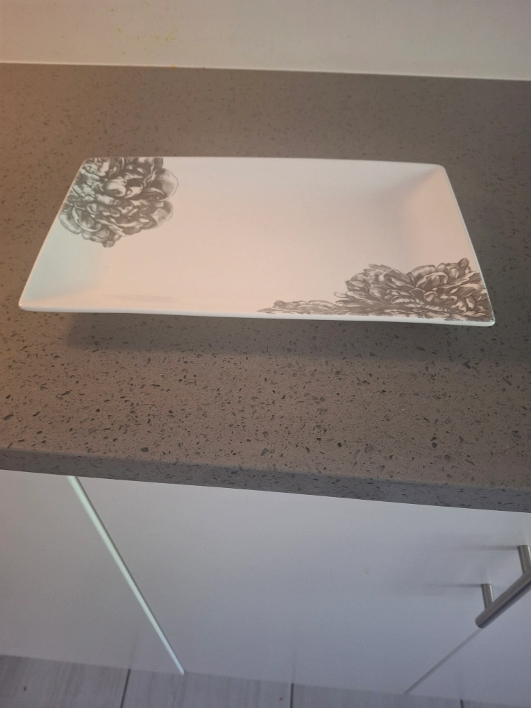 Selling a rectangular serving plates featuring a beautiful floral design. It's perfect for serving appetizers or desserts at your next gathering. The plate is in great condition and ready to add a touch of elegance to your table setting