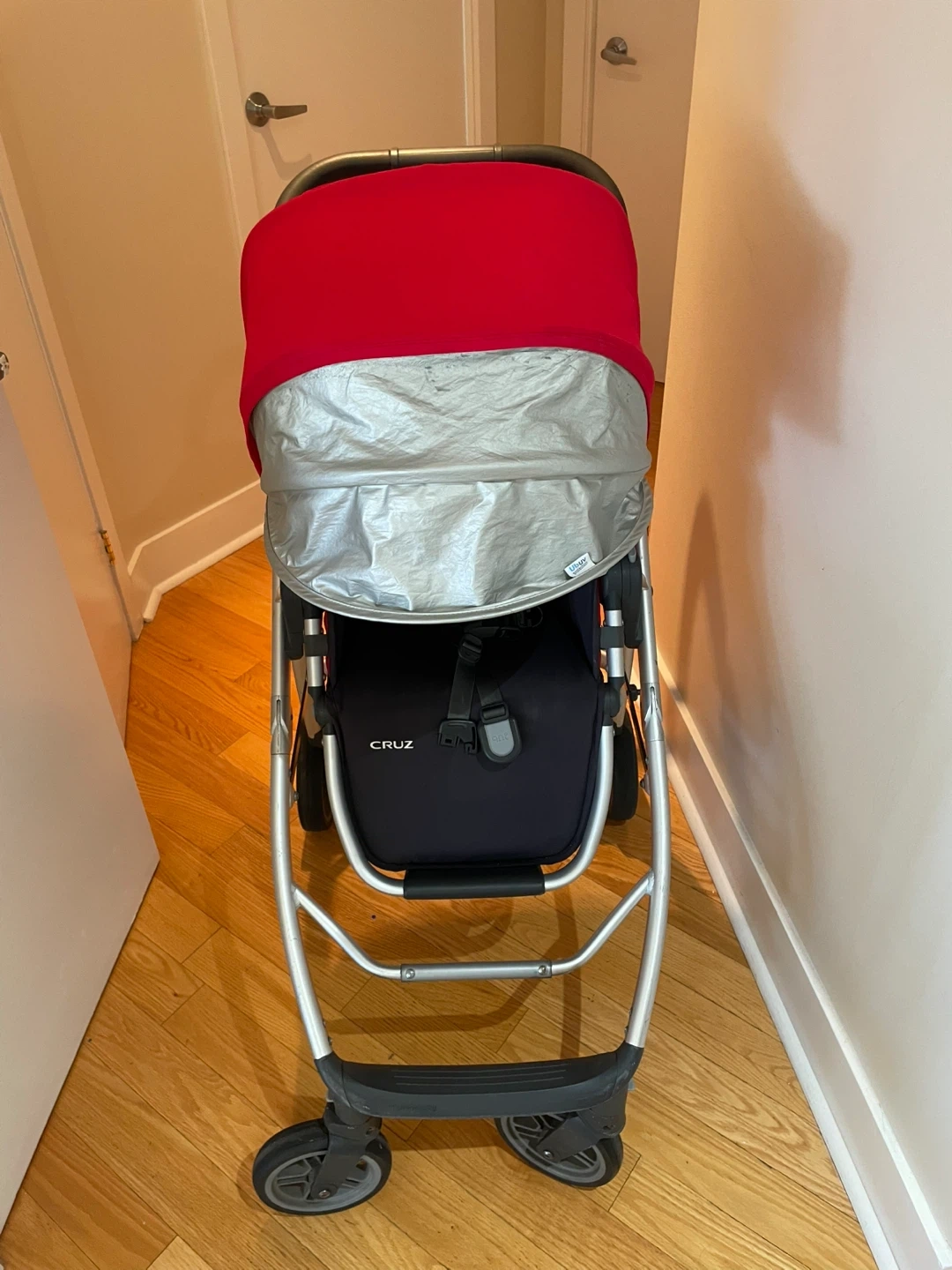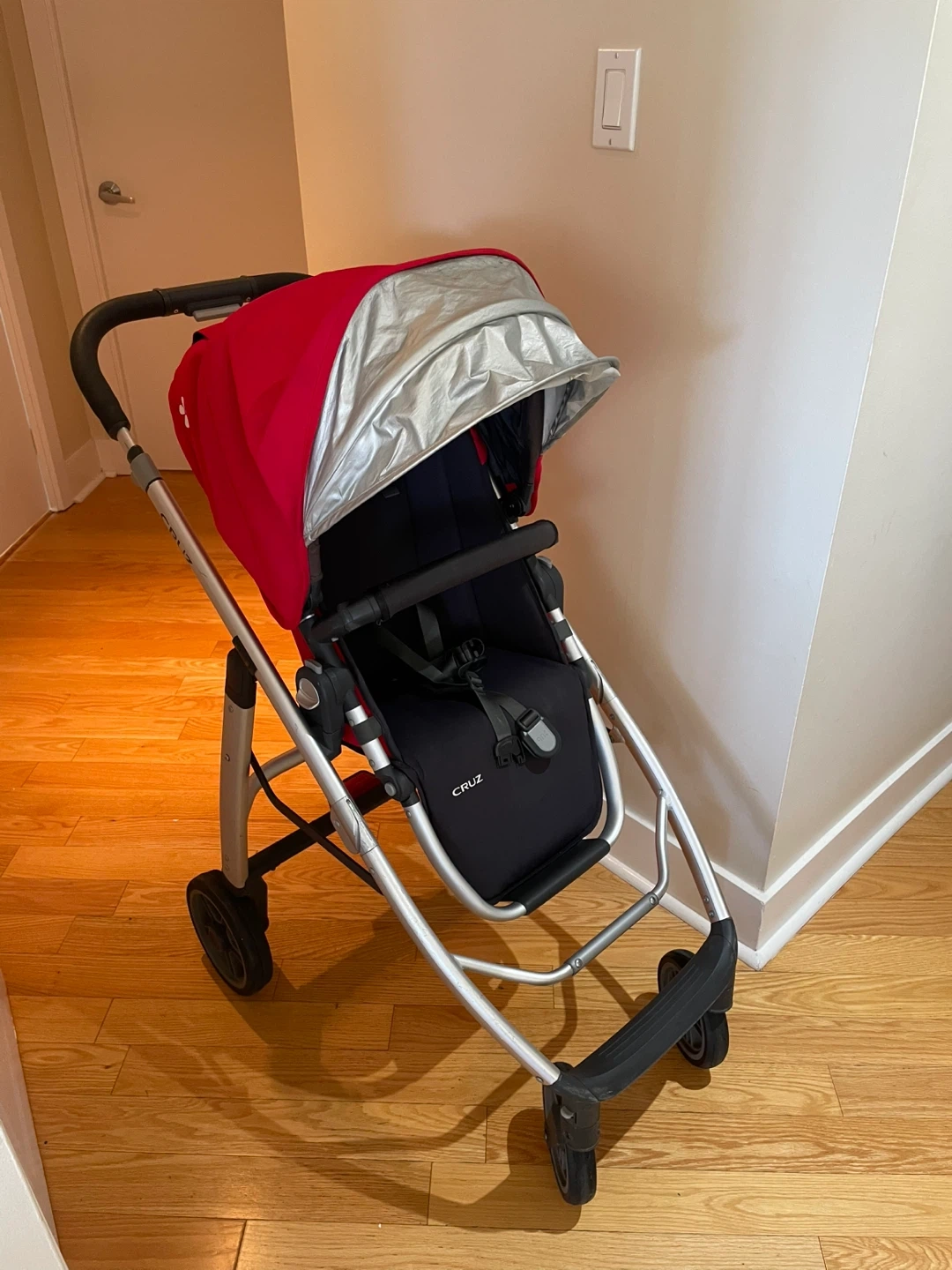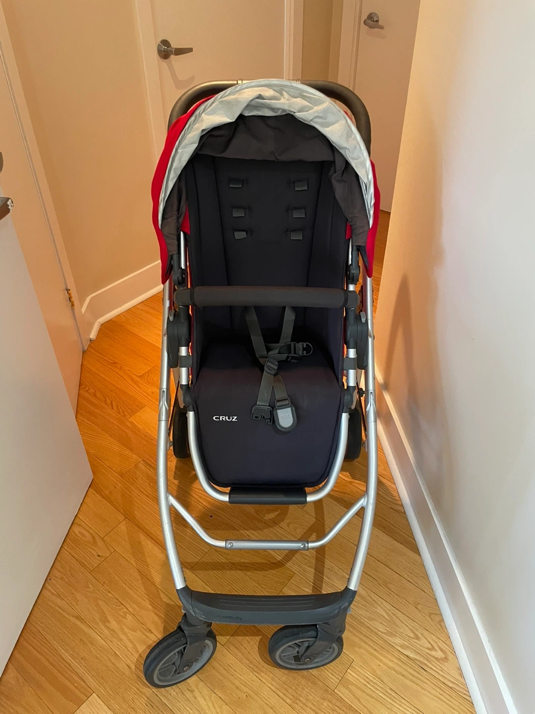 Selling a used UPPAbaby Cruz stroller in red and silver. It's in a very good condition. Some scratches on metal frame and rear wheels will need to be replaced soon. Otherwise it’s been very well maintained, just a bit of a sun damage.