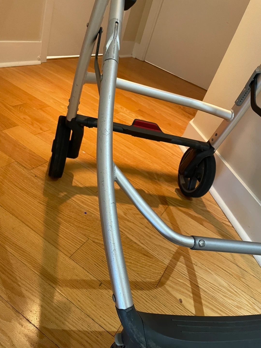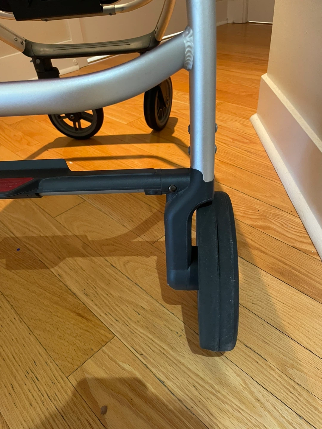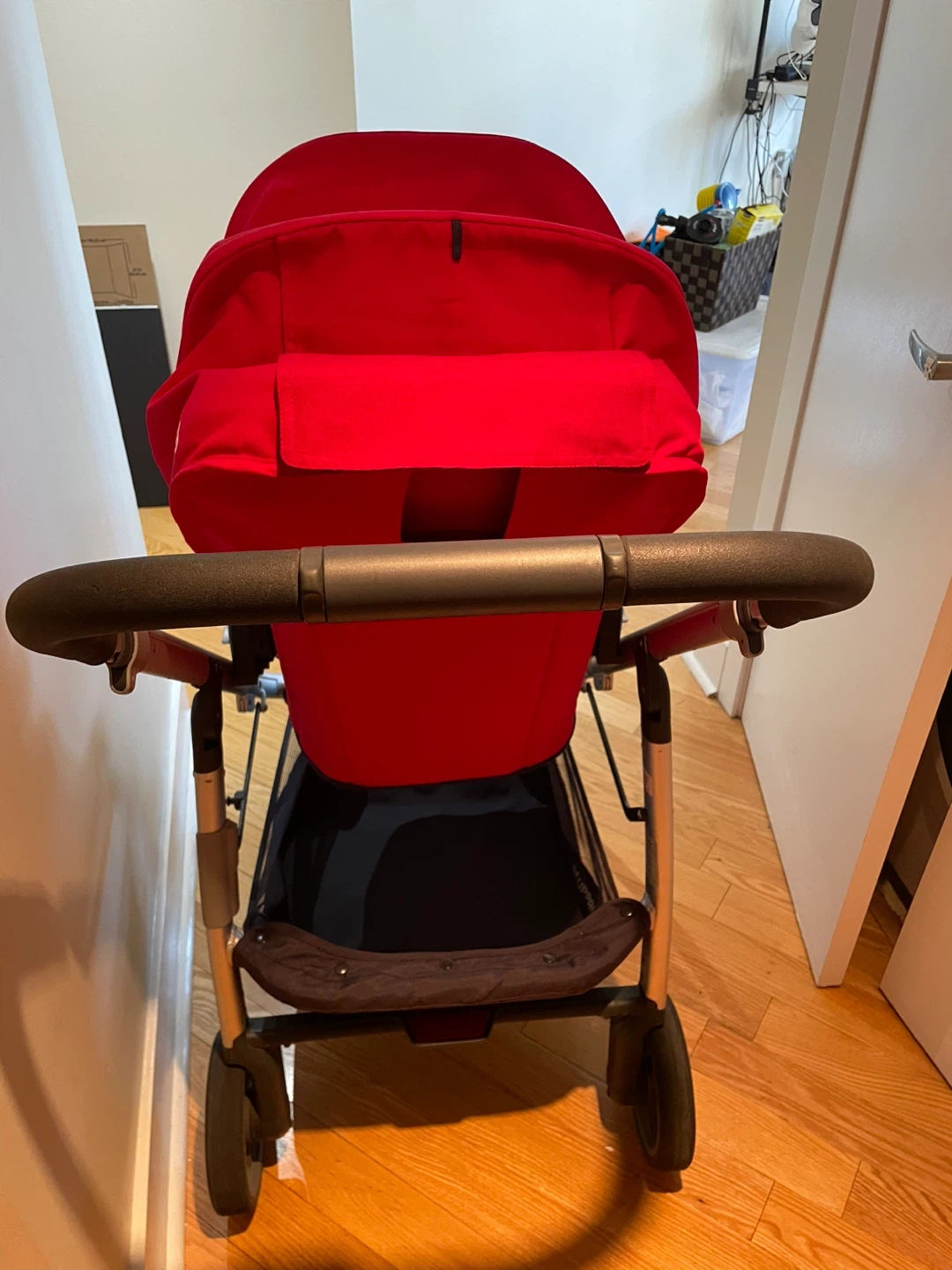 Selling a used UPPAbaby Cruz stroller in red and silver. It's in a very good condition. Some scratches on metal frame and rear wheels will need to be replaced soon. Otherwise it’s been very well maintained, just a bit of a sun damage.