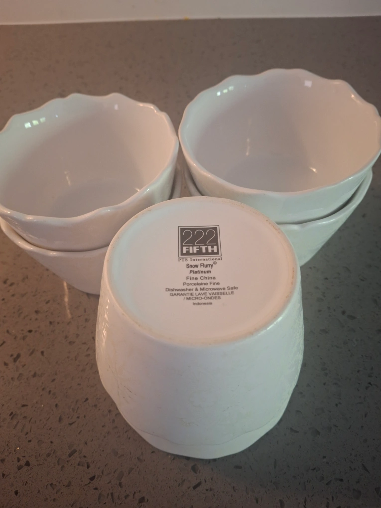 Selling a set of 222 Fifth 'Snow Flurry' bowls. They're made of fine china and are both dishwasher and microwave safe. Perfect for serving up snacks or desserts during the winter season!