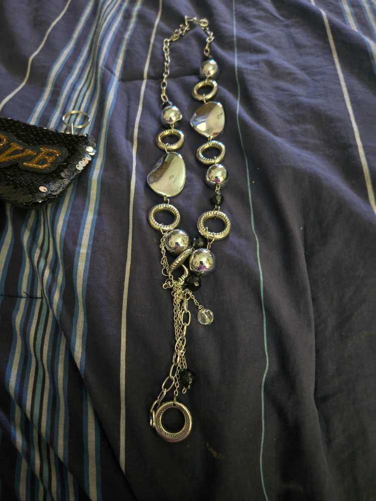 Here's a stylish silver-tone statement necklace! It features a mix of silver and black beads, and a variety of shapes and chains for a unique look