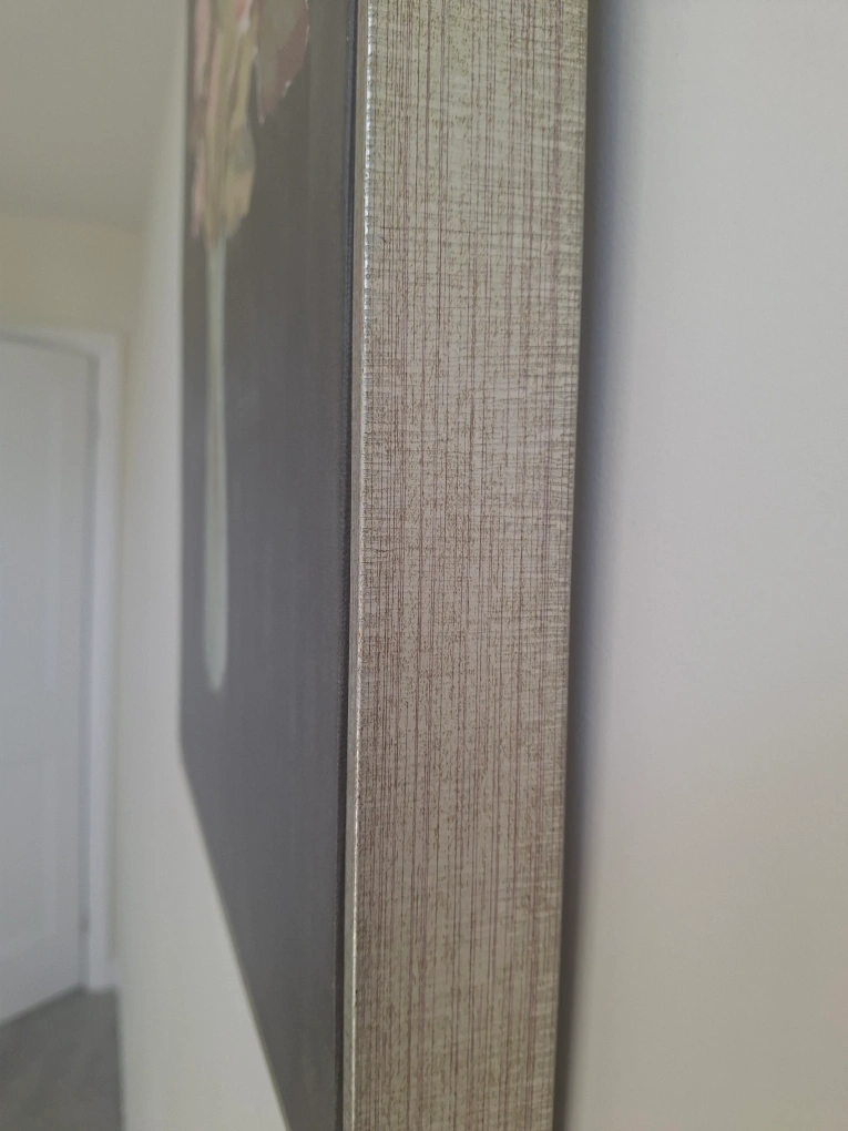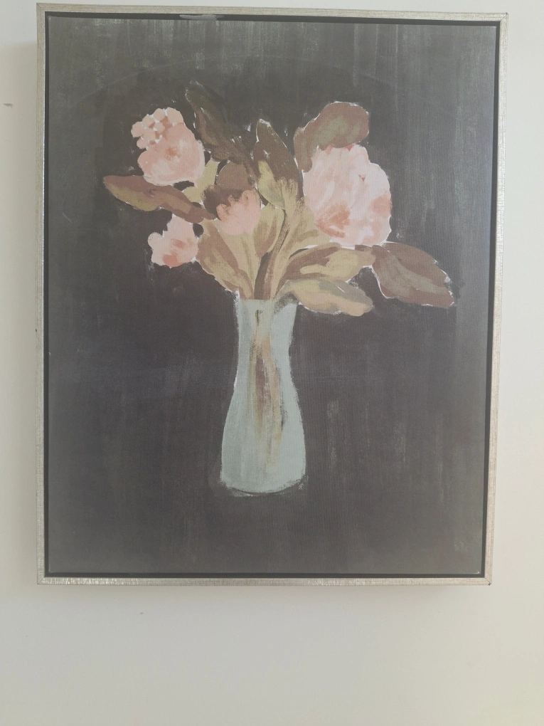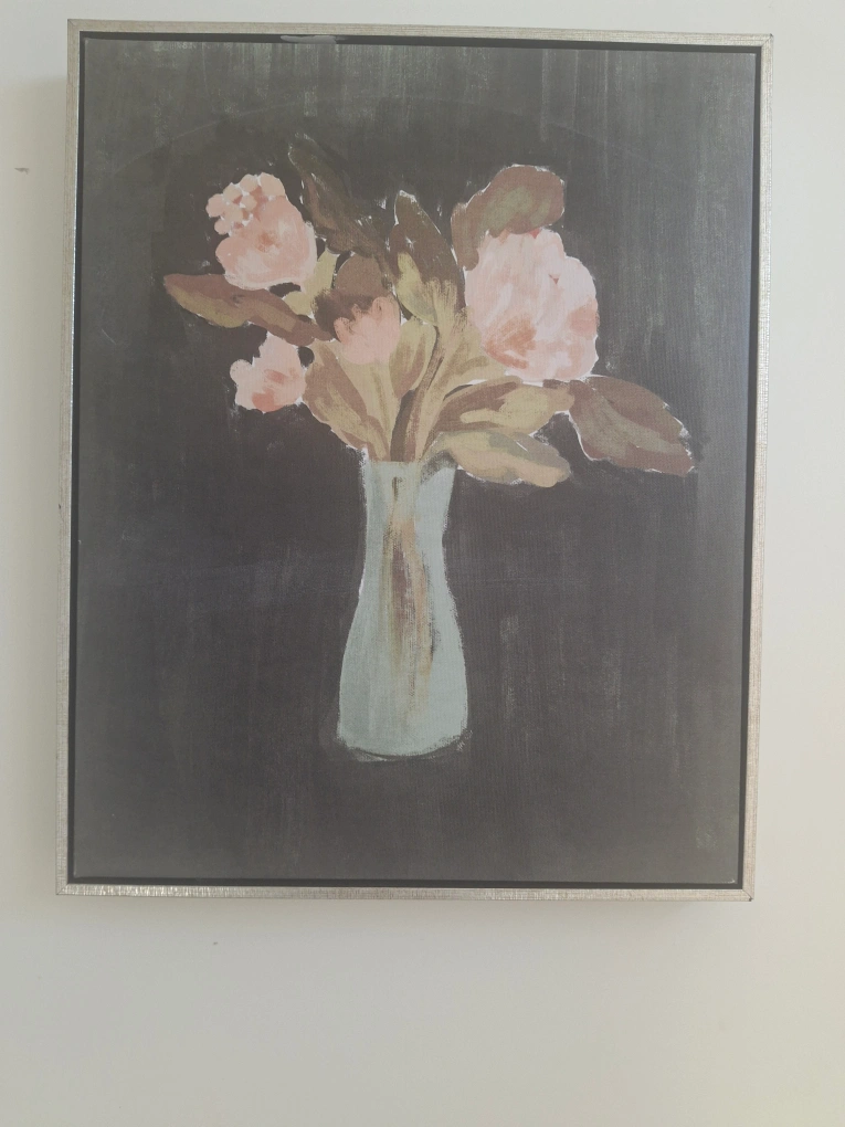 Selling a lovely floral canvas wall art piece. It features a vase of pink and beige flowers against a dark background, framed in a light silver-tone frame. It's in great condition and would look great in any room