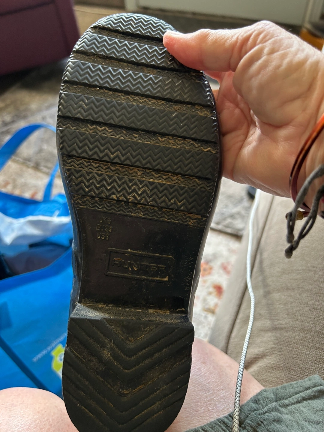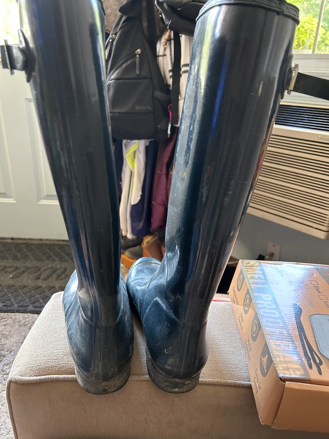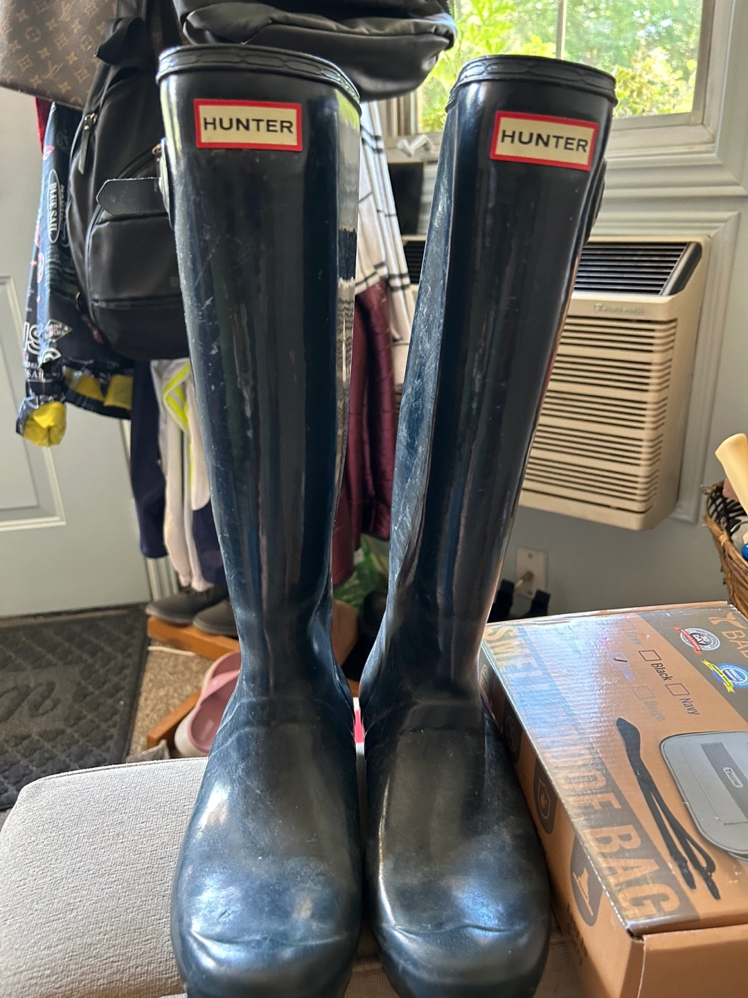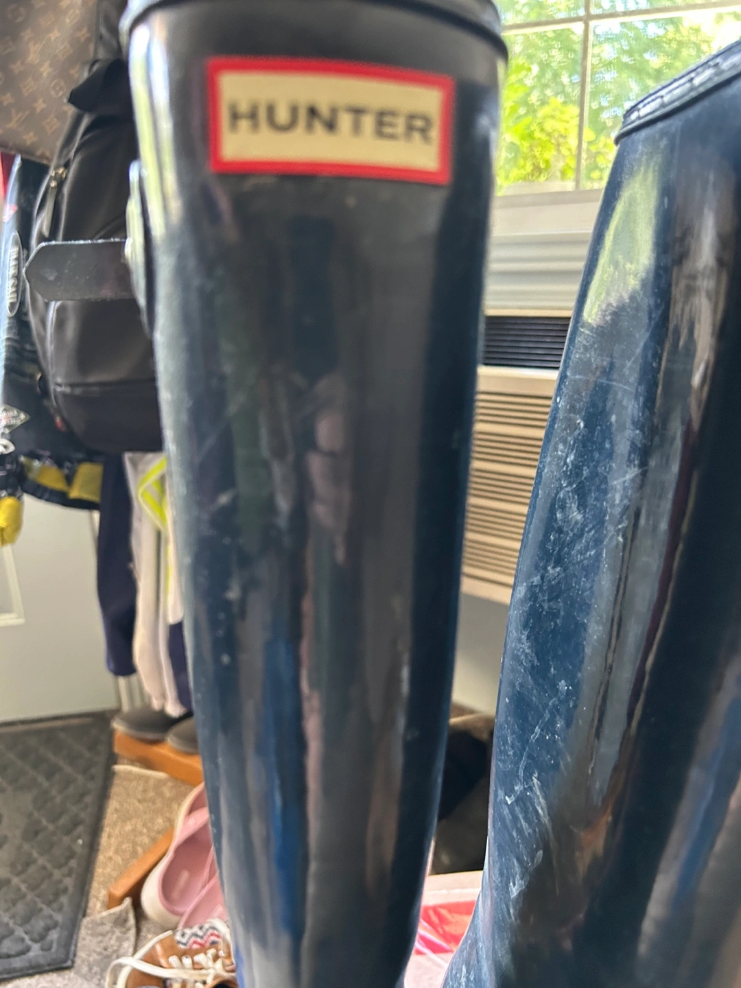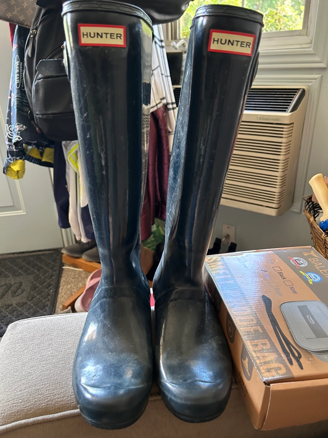Selling a pair of Hunter rain boots in dark blue. They are a size US 8. These boots are perfect for rainy days or muddy adventures!