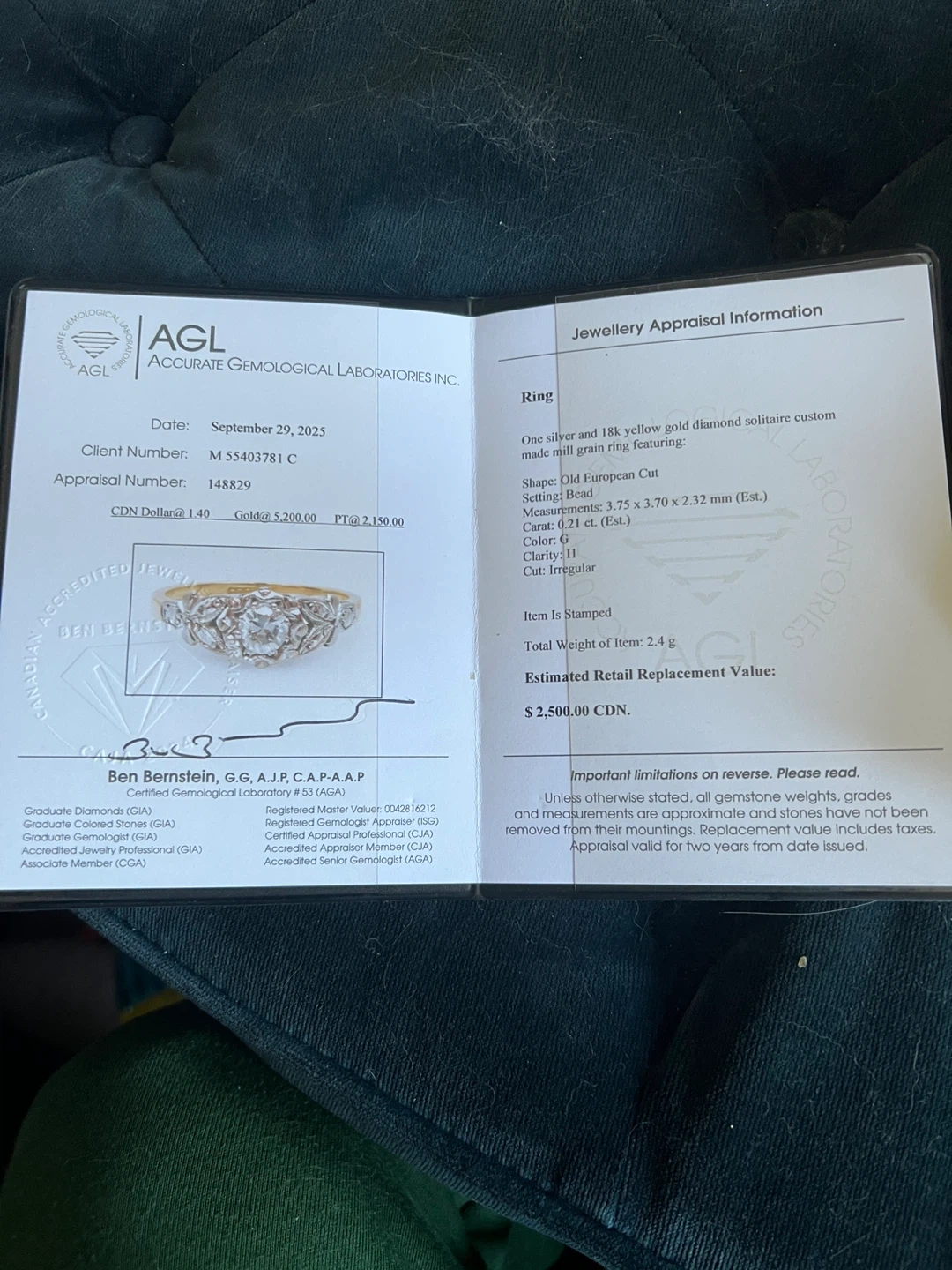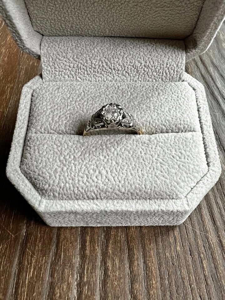 85Material: Platinum and 18k gold. Diamond: Solitaire, old European cut. Style: Vintage. Size: 4. This ring is truly one of a kind, with its classic design and brilliant sparkle. It's not just a piece of jewelry—it's a conversation starter! I’ve received countless compliments on it. Whether you're a vintage enthusiast, looking for a unique engagement ring, or searching for a meaningful gift, this ring is perfect. Appraised in October 2025 at $2500. Pickup in Parkdale.