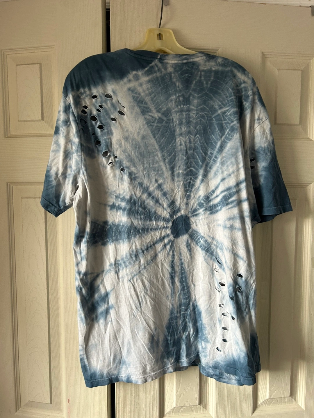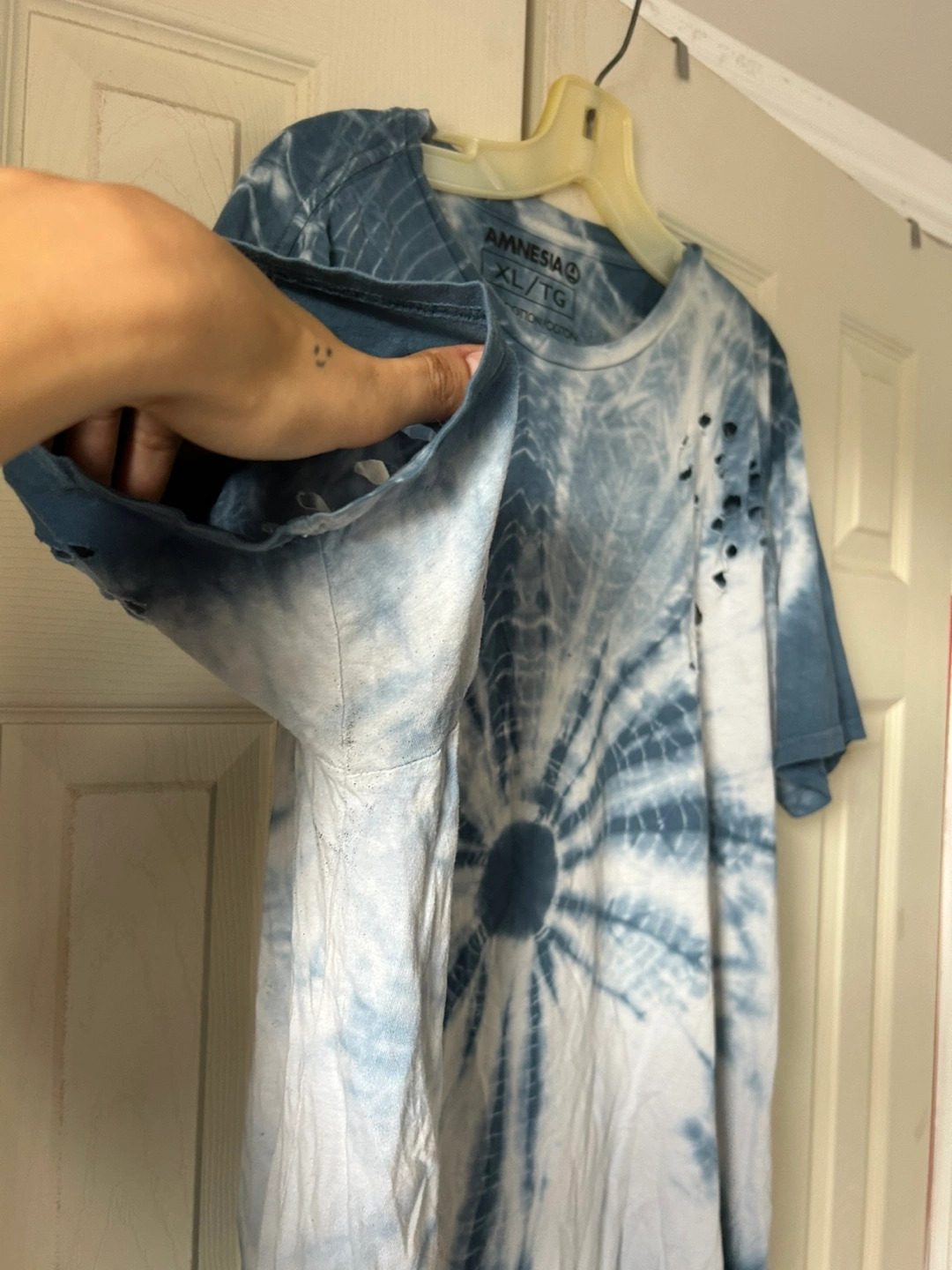 Tie dye t-shirt from Amnesia in size XL! It's a blue and white colour with a unique tie dye pattern. It is made of 100% cotton. Please note there are some distressed details (holes).