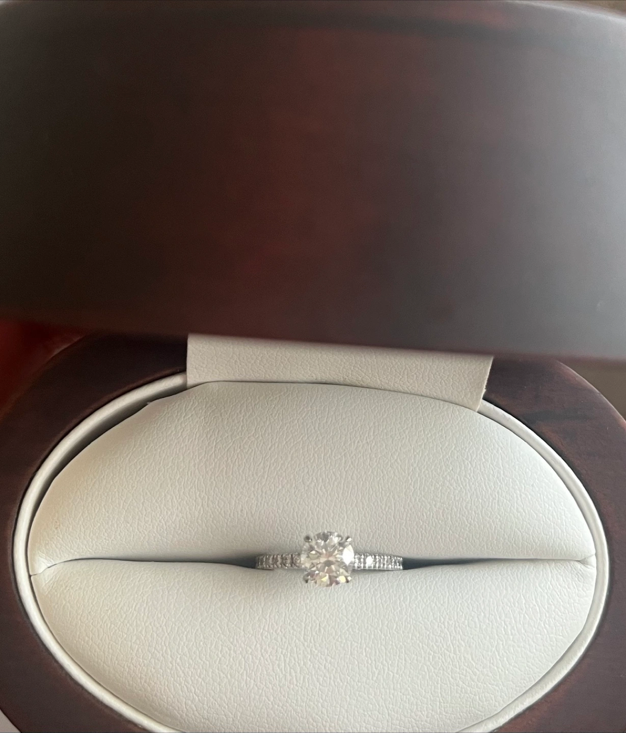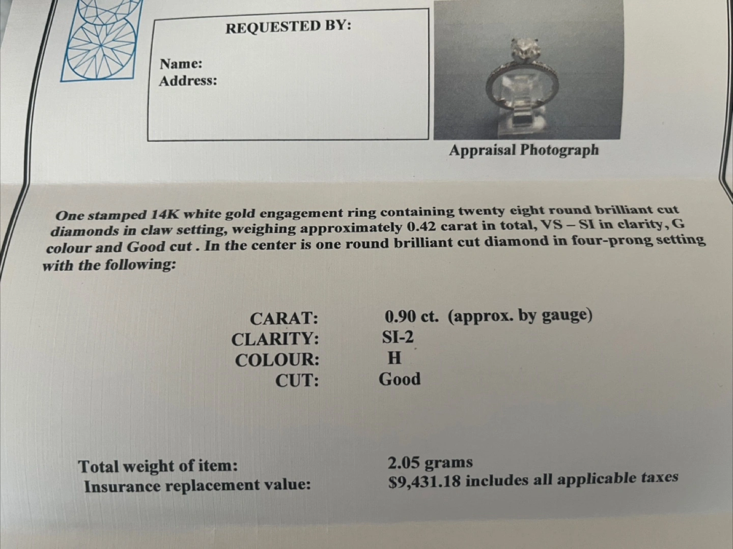 Selling a beautiful 14K white gold engagement ring. It features a 0.90 carat round brilliant cut diamond in a four-prong setting. The diamond has SI-2 clarity, H colour, and Good cut. The ring also contains twenty-eight round brilliant cut diamonds in claw setting, weighing approximately 0.42 carat in total. Total weight of item is 2.05 grams