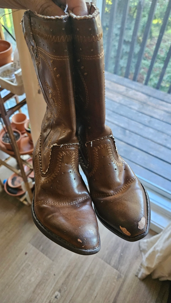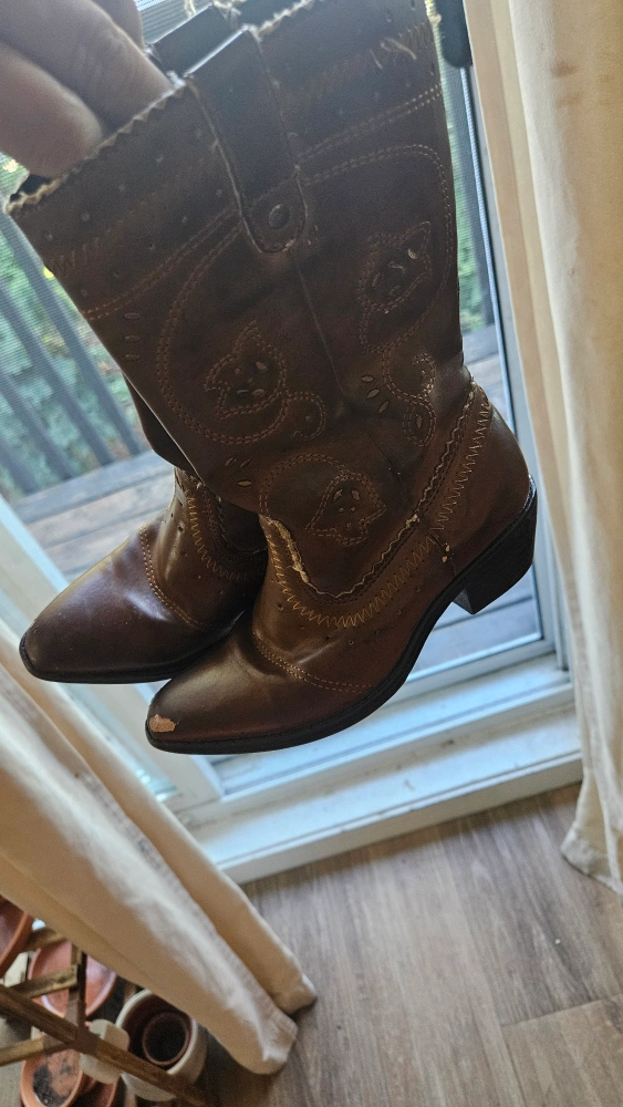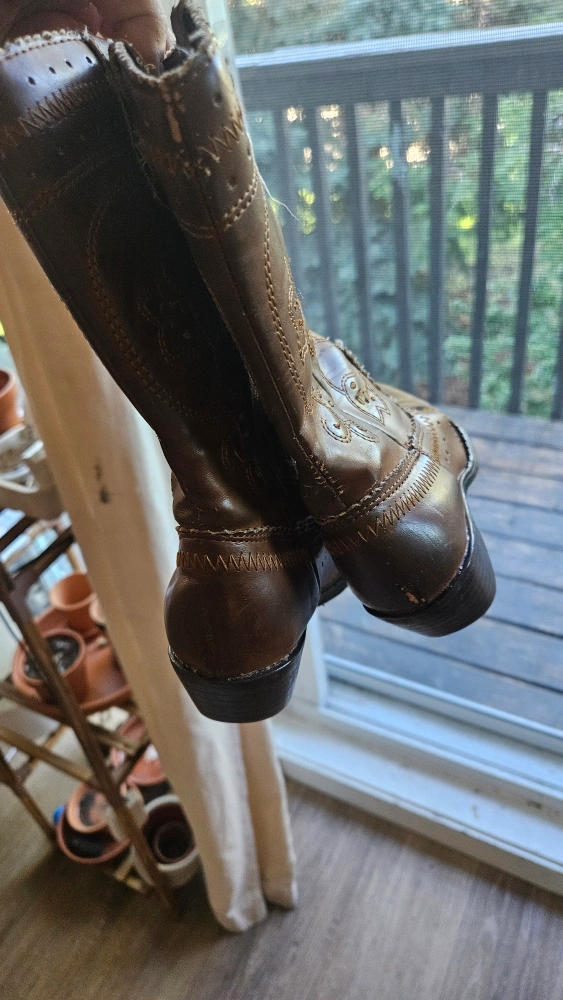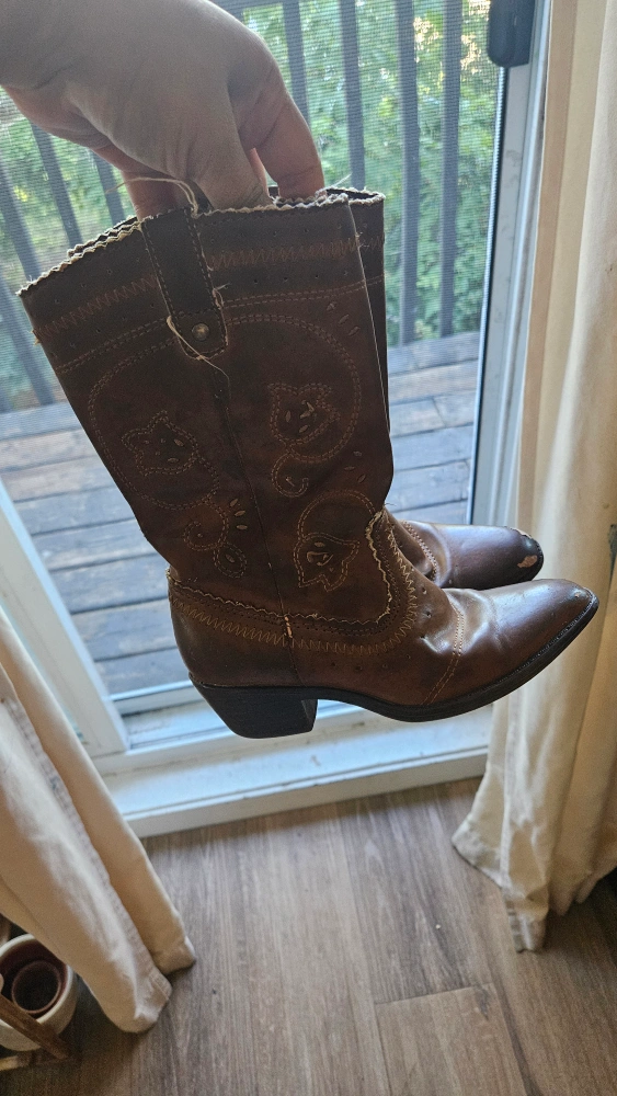 These are a pair of brown cowboy boots. They show some signs of wear, as you can see in the photos, but they've still got lots of life left in them! Perfect for adding a bit of western flair to your outfit.