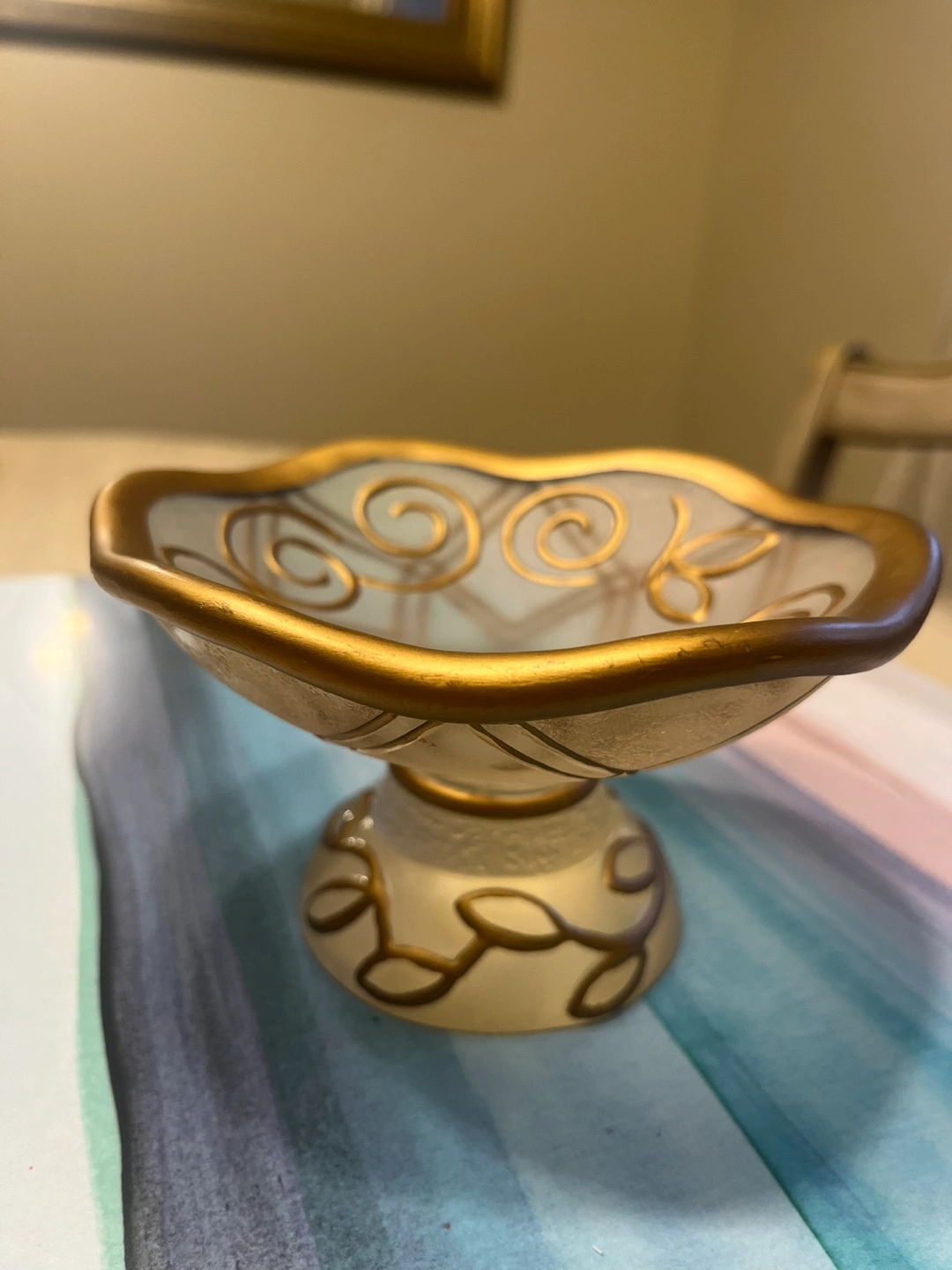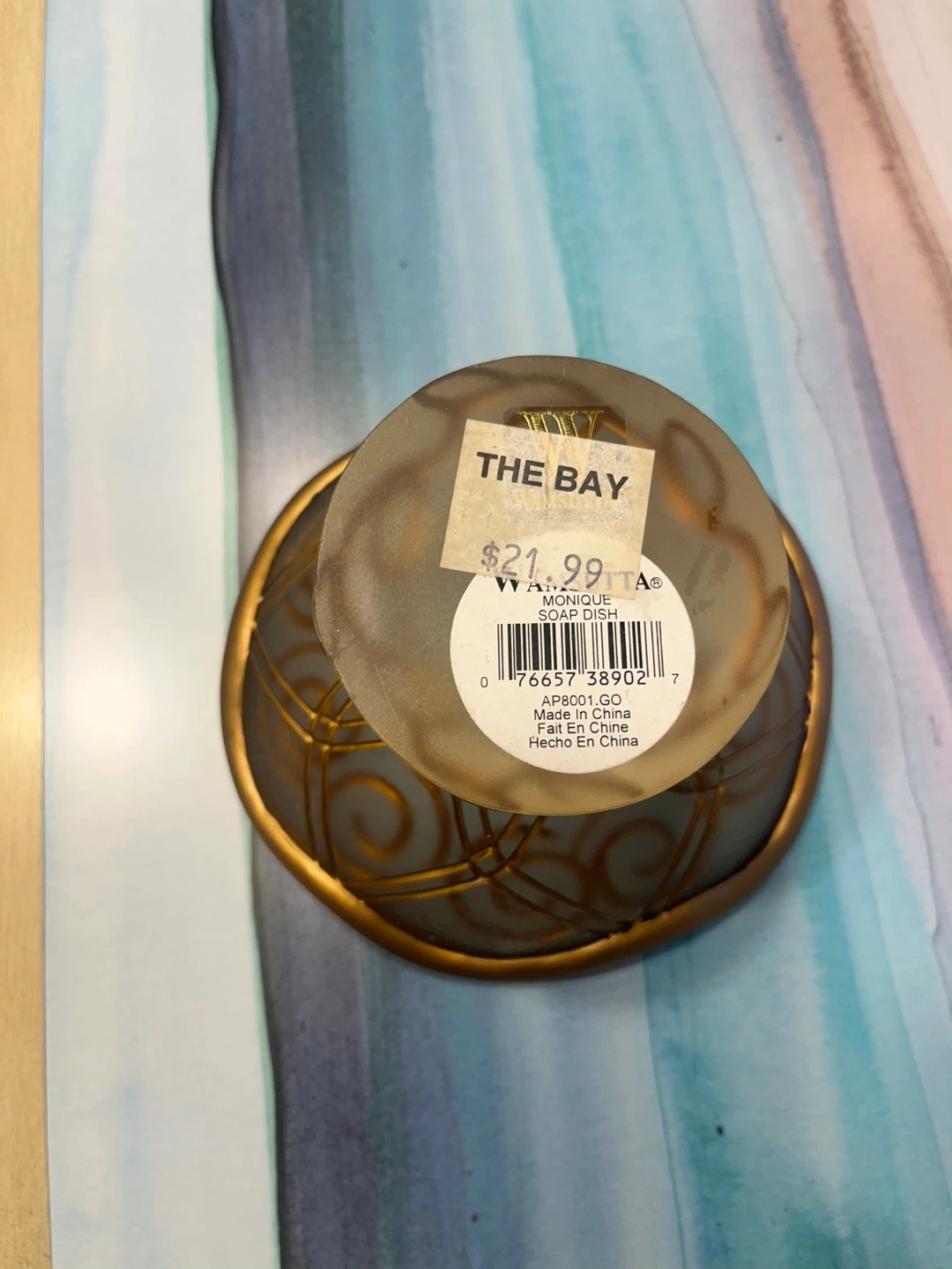 Wamsutta “Monique” resin soap dish, originally from The Bay- price sticker still on the bottom, originally 21.99. Frosted look with painted gold accents and detailing (some gold paint transfer can be seen in the dish- it came that way). Can be found elsewhere online for $30+. 5.5” wide and 3.5” tall.
