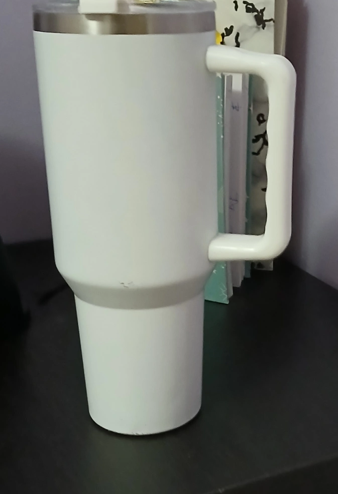 Selling a white stainless steel tumbler. It has a handle and a lid. There are some signs of use, as shown in the pictures