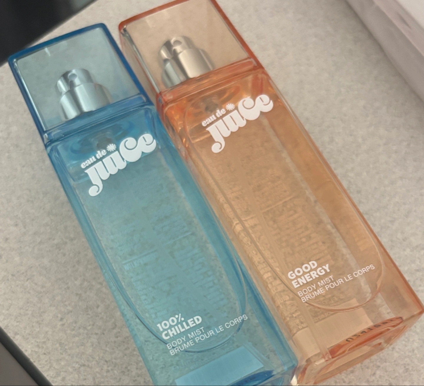 Selling two Eau de Juice body mists. One is 100% Chilled, and the other is Good Energy. They're both body mists (brume pour le corps). Perfect for a quick refresh! New never used 2 x $75 ml Selling for $10