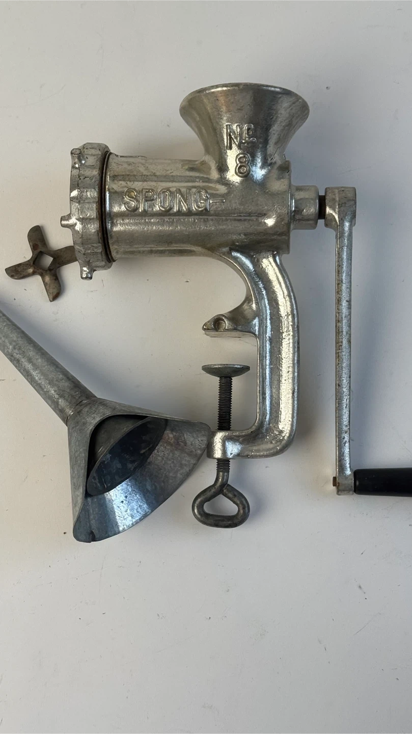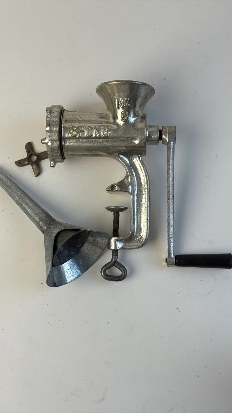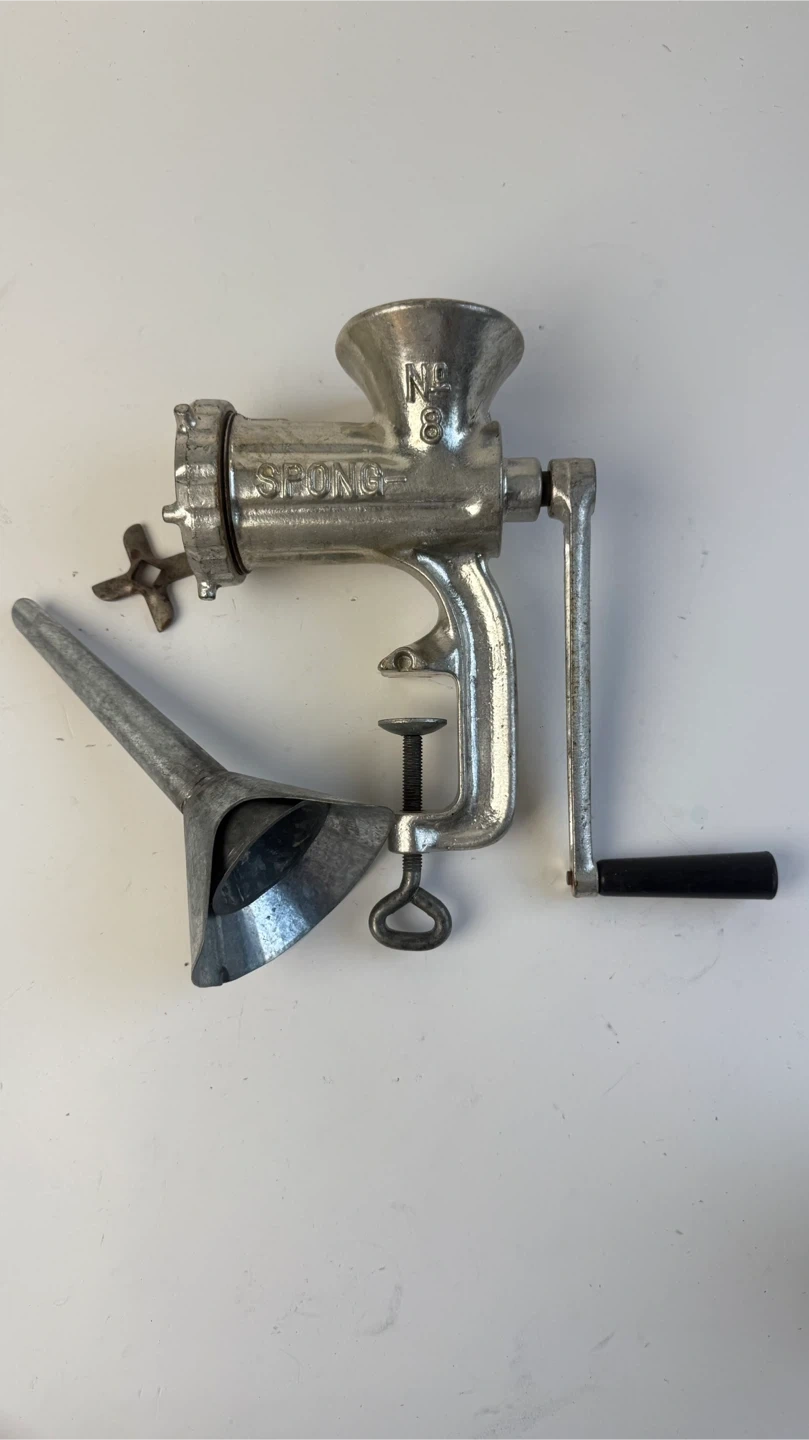 Selling a vintage Spong No. 8 meat grinder! It's a classic piece with a clamp for easy attachment to your countertop or table. Perfect for making homemade sausages or grinding your own meat for burgers. A great addition to any kitchen!