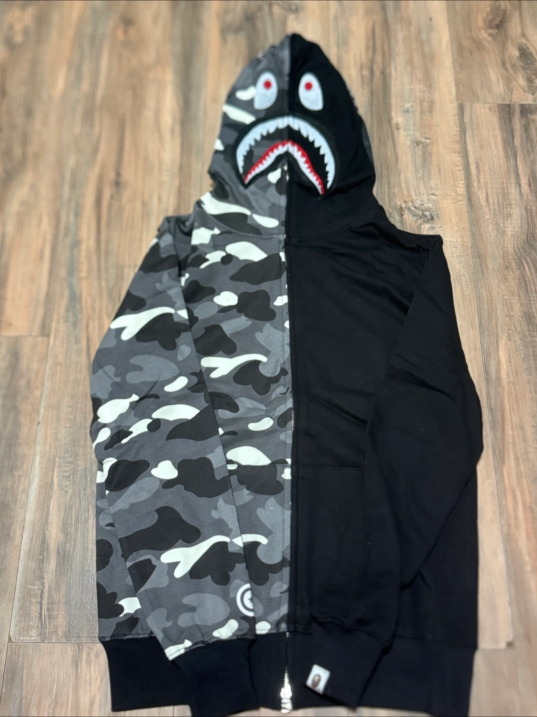 Selling a BAPE (A Bathing Ape) Shark Full Zip Hoodie! It features a unique half camo, half black design with the iconic shark face on the hood. Great for adding a statement piece to your wardrobe!