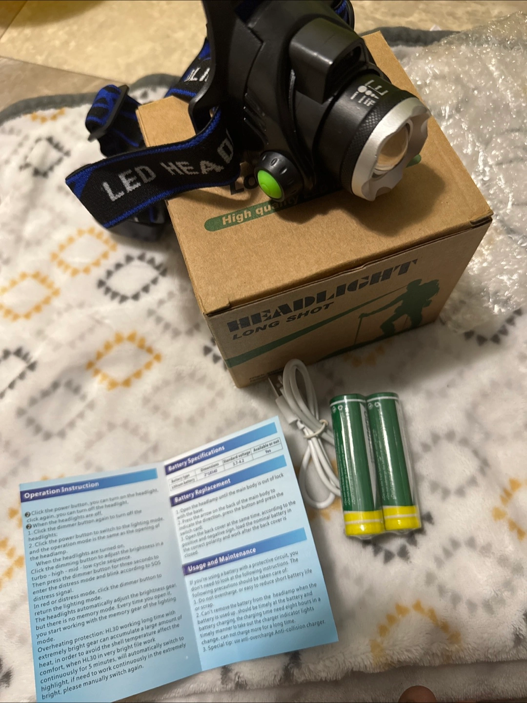 Selling a LED Headlight, perfect for outdoor activities such as caving, night walking, camping, night riding, outdoor mountaineering and hunting. Includes the box and all components! Rechargeable batteries 4200 two cell.