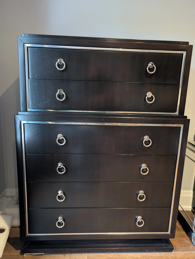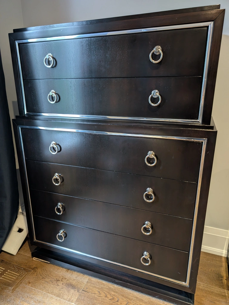 Here's a lovely dark wood chest of drawers that would look great in any bedroom or living space. It features a classic design with silver-tone ring pulls. The drawers are quite spacious, providing ample storage. The wood has a rich, dark finish that adds a touch of elegance to the piece