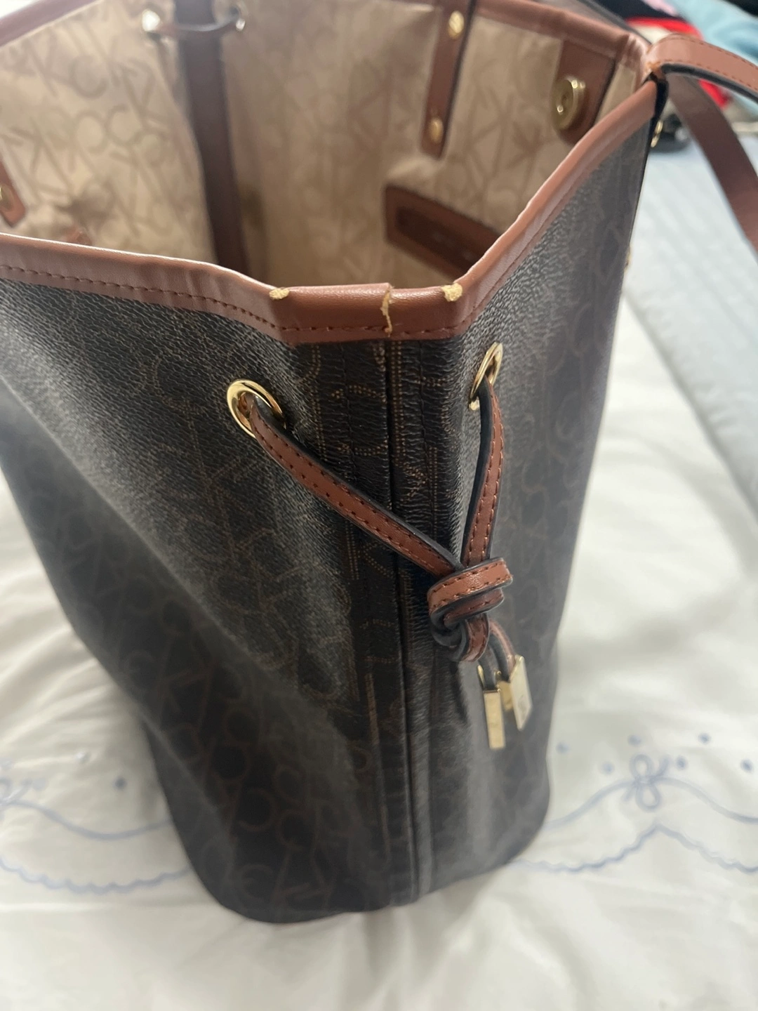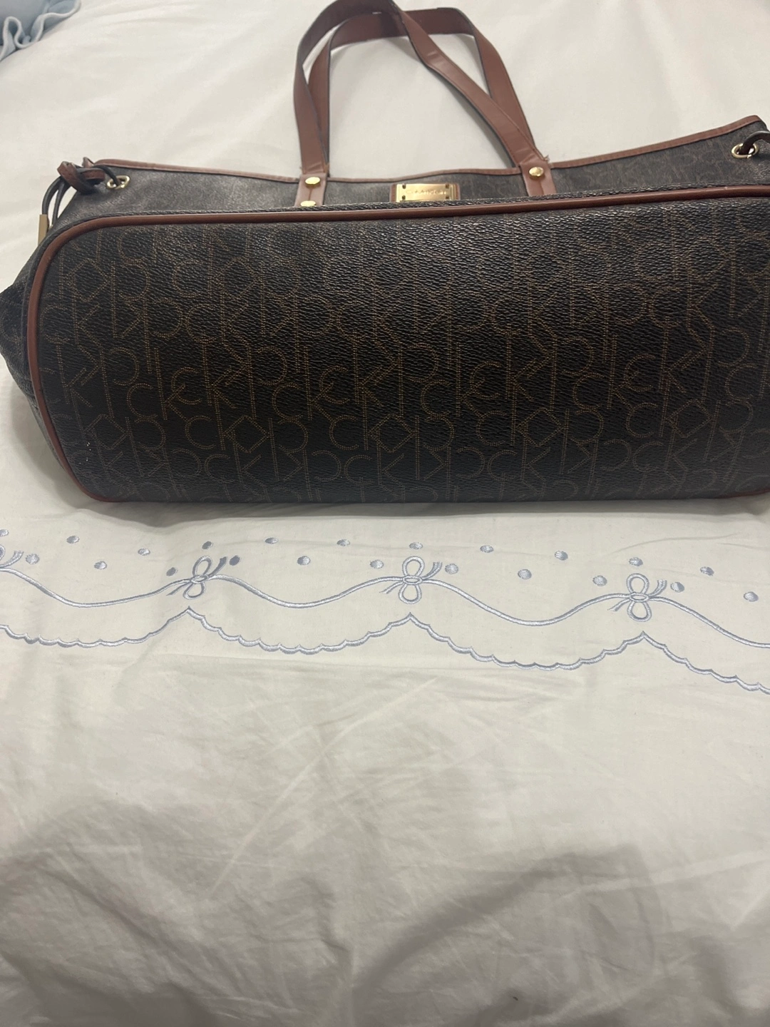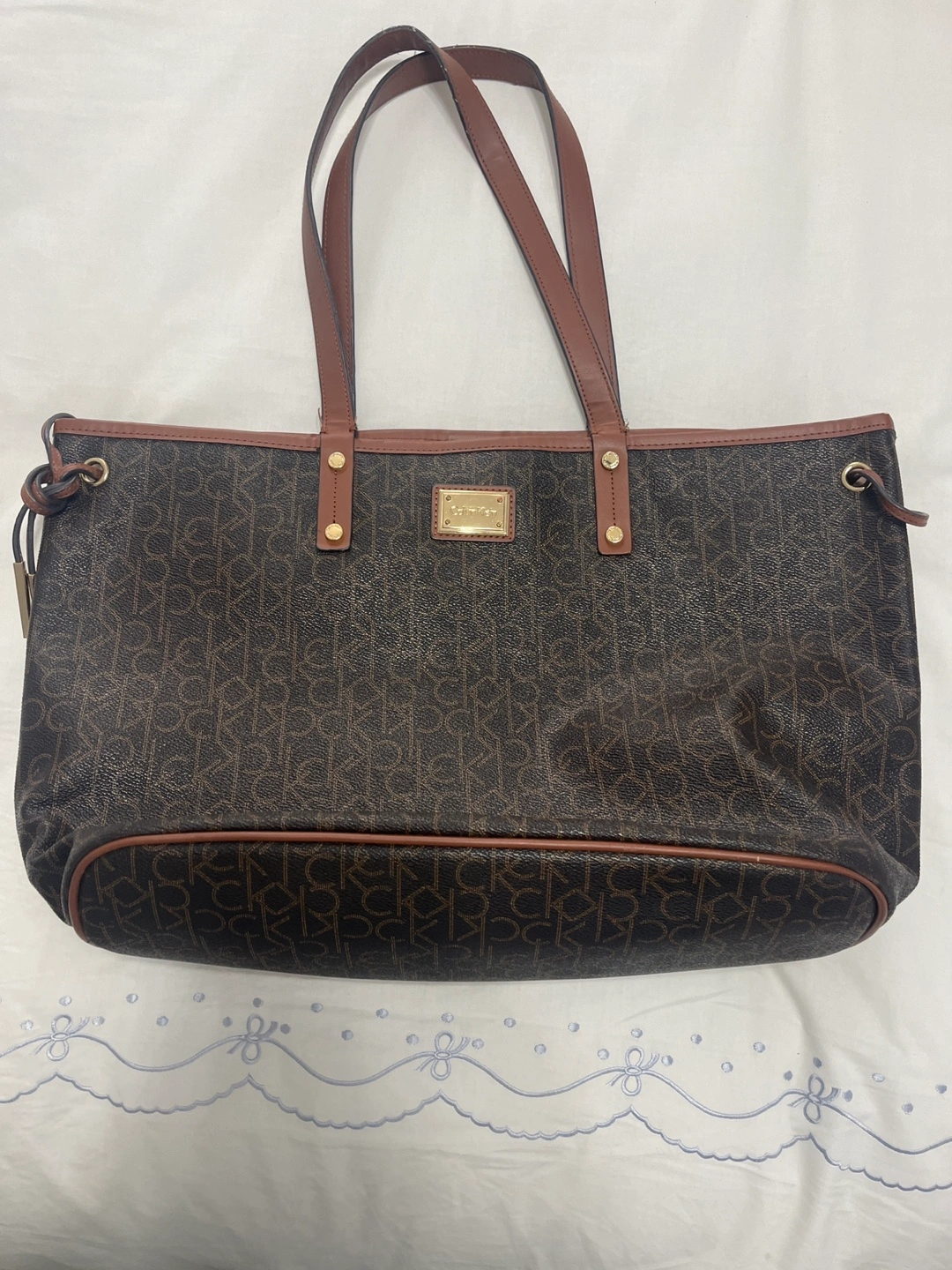 Selling a Calvin Klein tote bag! It's a stylish brown color with the CK logo pattern throughout. Perfect for everyday use and carrying all your essentials. See pics closely and feel free to ask questions. The ends have small chips not visible when the bag is closed. Very clean on the inside too.