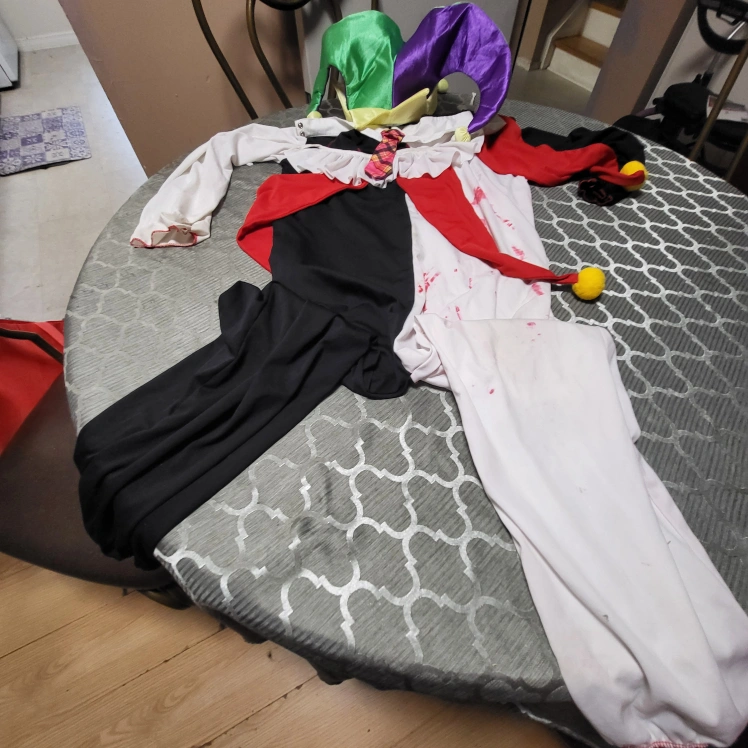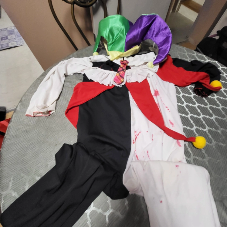 Harlequin/Jester costume. It features a colourful jester hat, a ruffled collar, and a playful tie. The costume has a mix of colours including red, white, black, green, and purple, making it a fun and eye-catching outfit.
