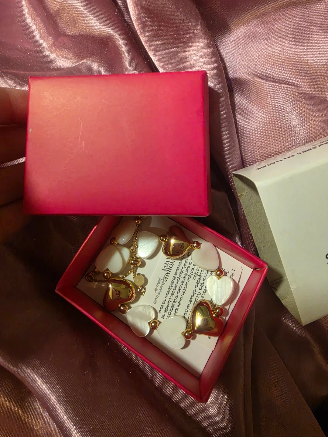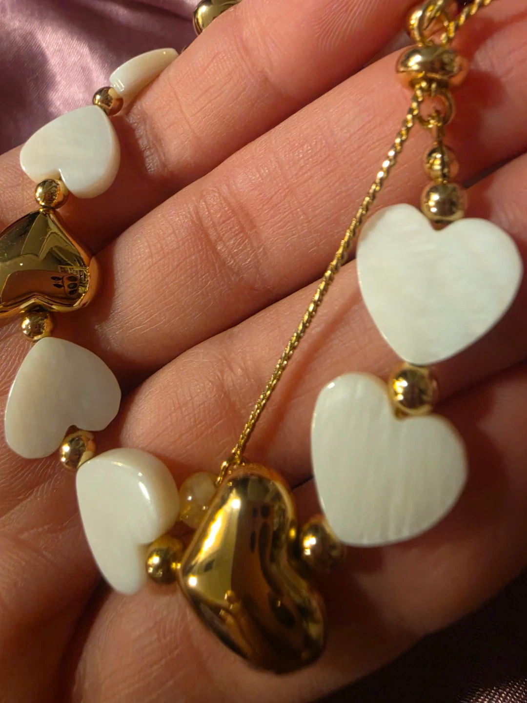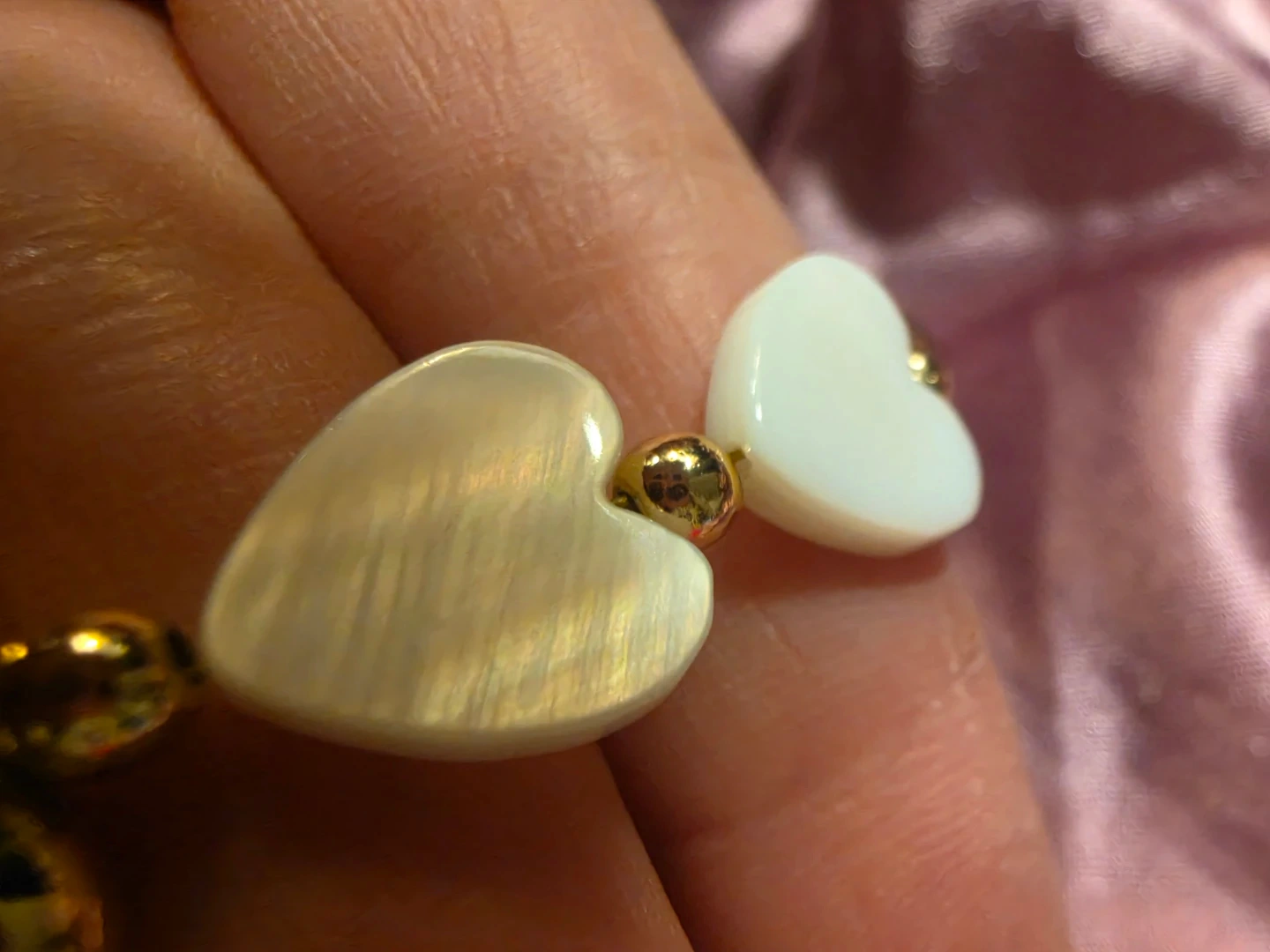 Mother of Pearl Sincere Heart Bracelet Bestie. It's a dainty bracelet with white heart-shaped mother of pearl and gold-tone heart charms. Adjustable string closure.