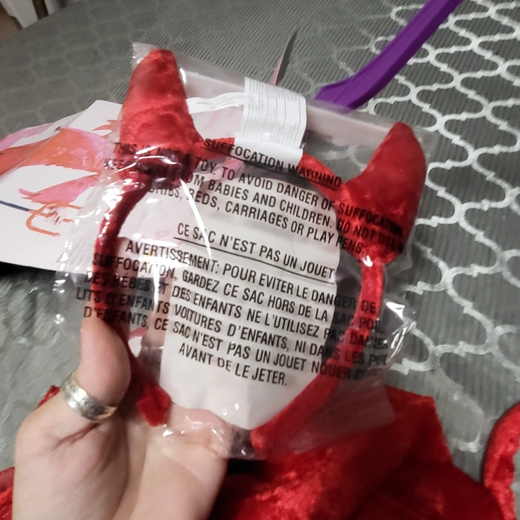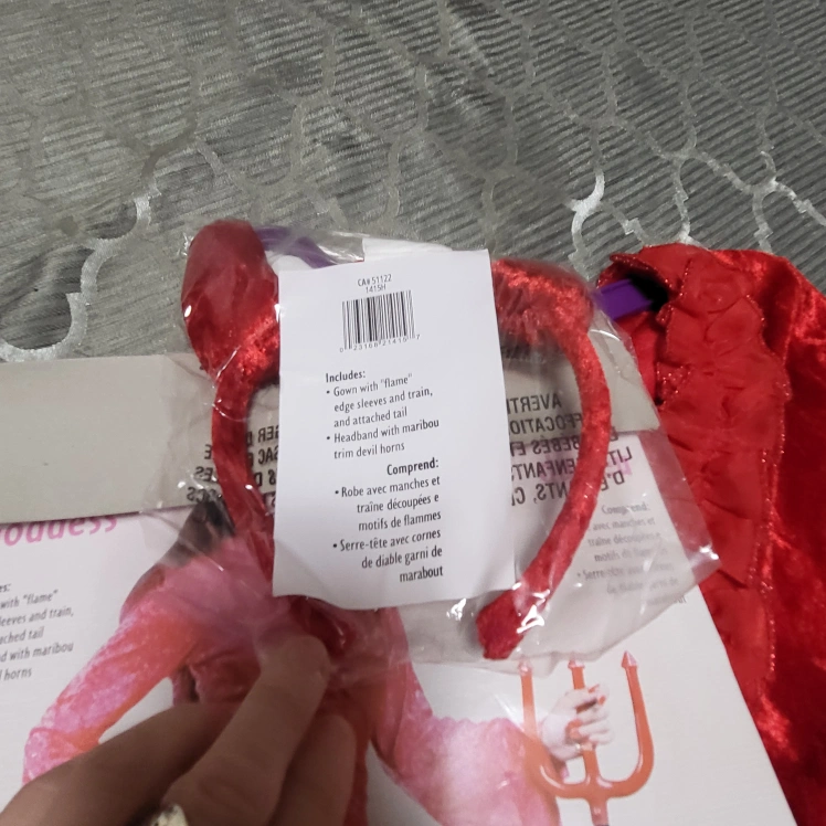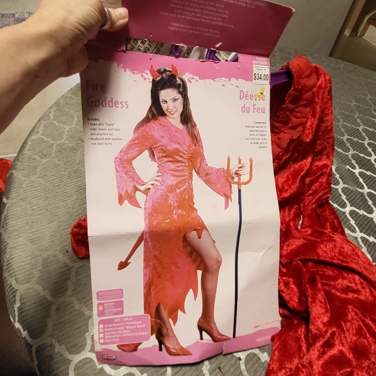 new Fire Goddess costume in adult size med - large! This red costume includes the dress with 'flame' edge sleeves and trim, a tail, and a devil horn headband and red Mask.