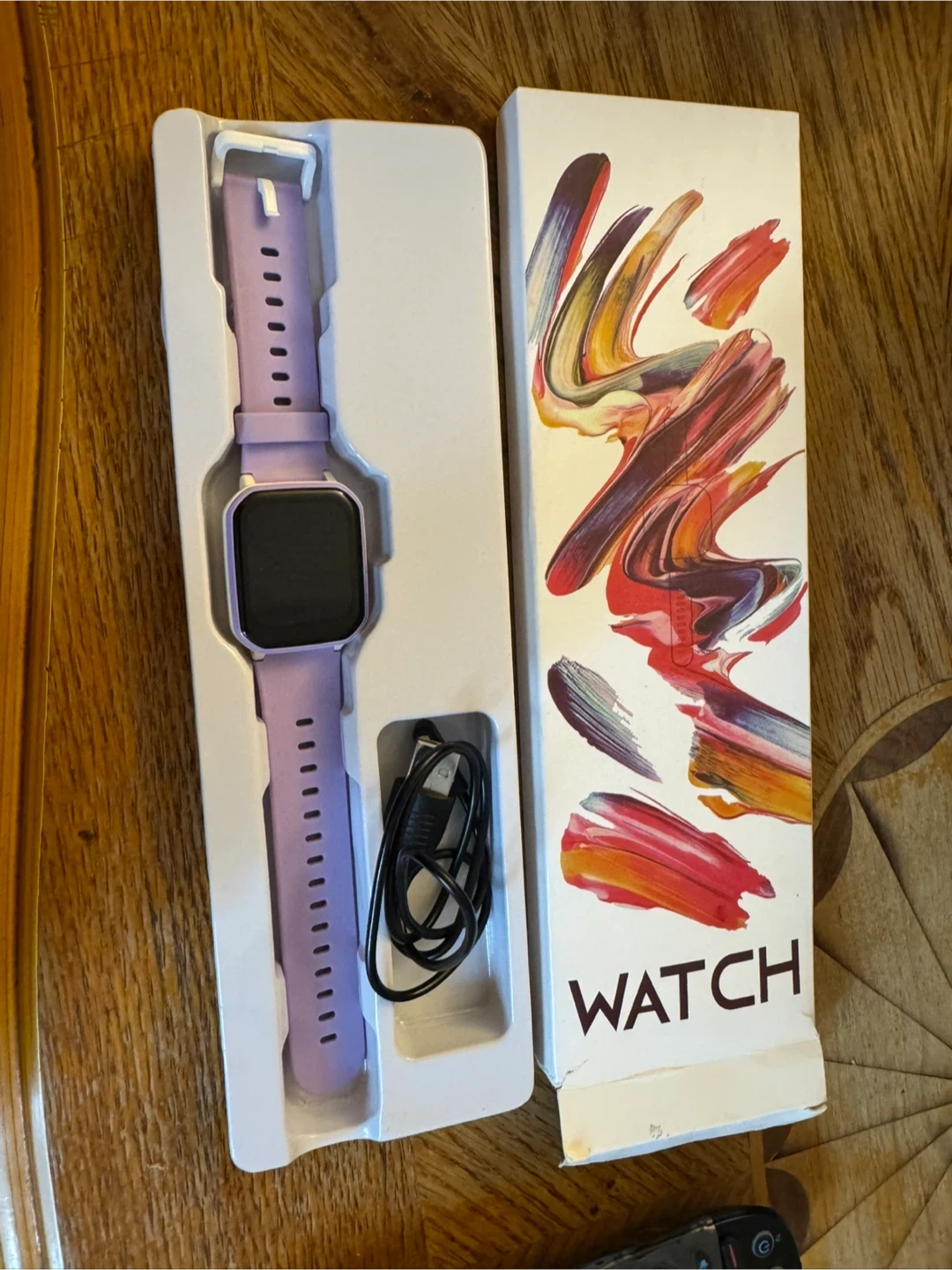 16Selling a purple smart watch. It comes with its original box and a charger. Great for keeping track of time and staying connected!