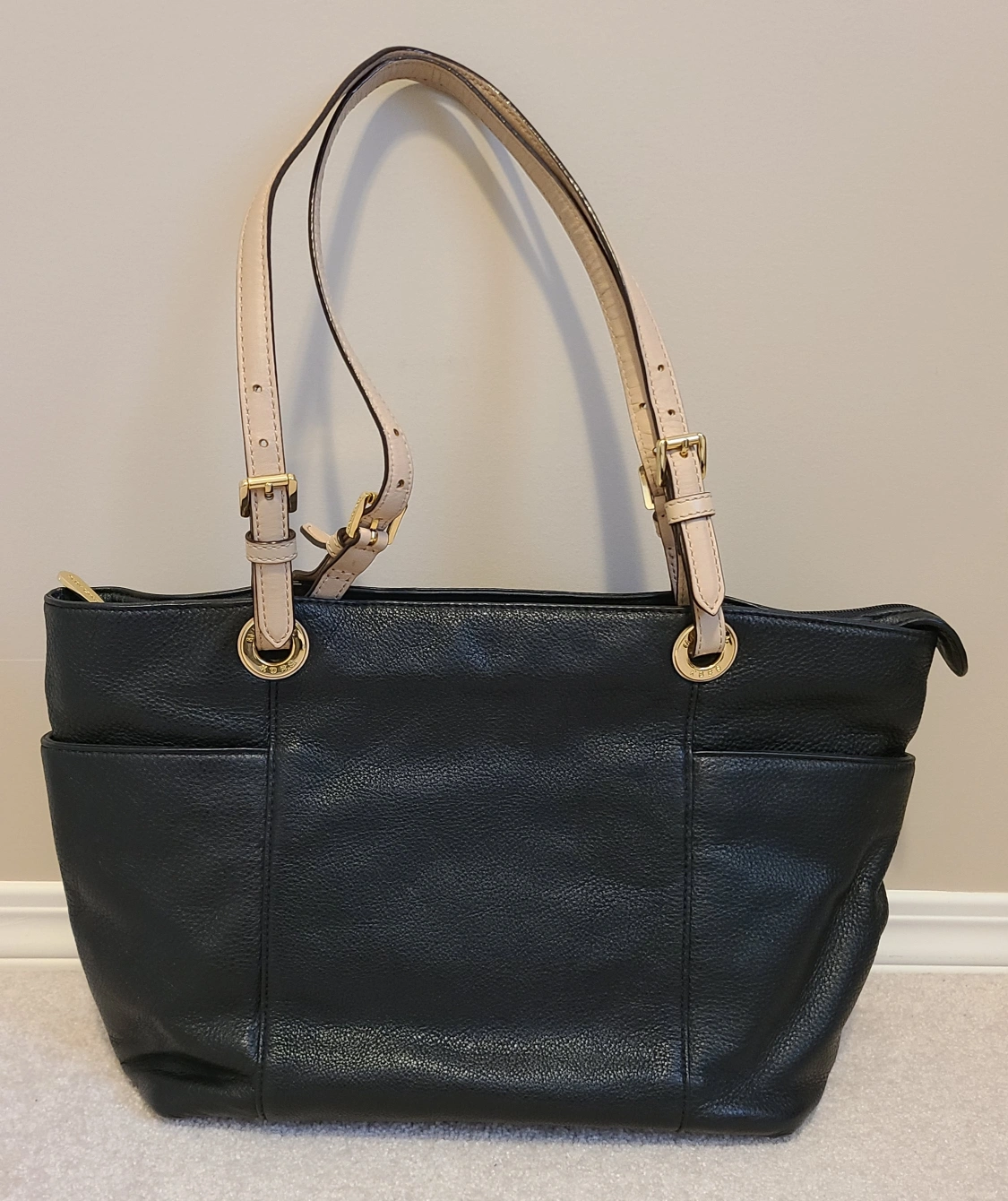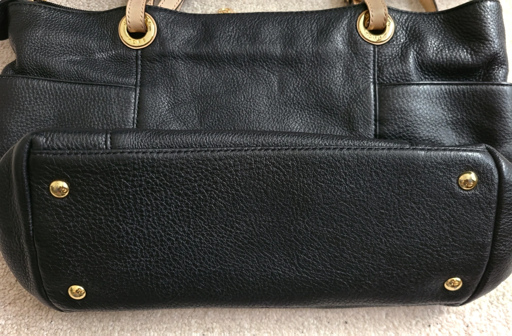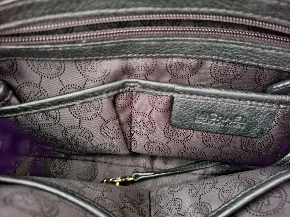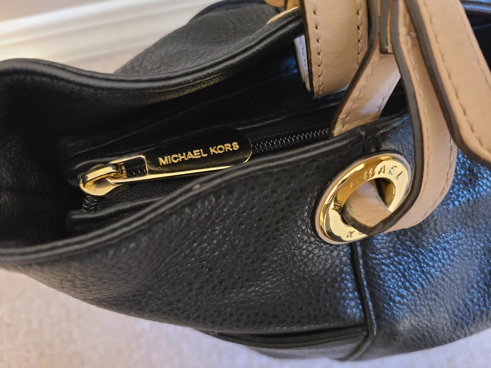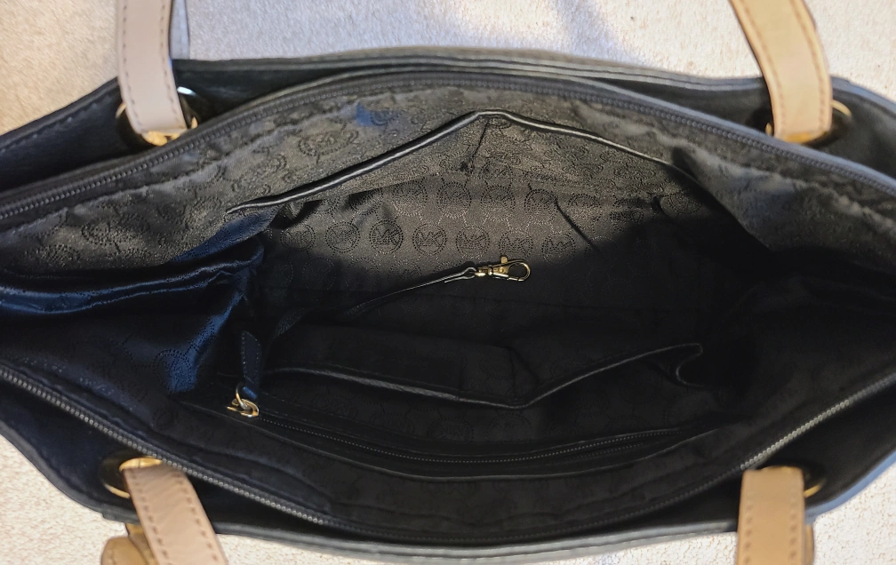 This is a black leather MK bag with beige straps and gold hardware. There are two open pockets on the outside; and inside there are 4 open pockets, 1 zipper pocket plus a key chain. It's in great condition and comes with original dust bag.