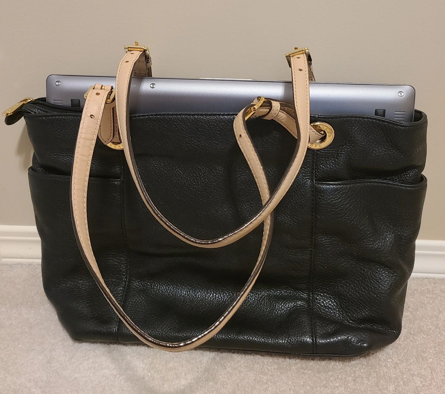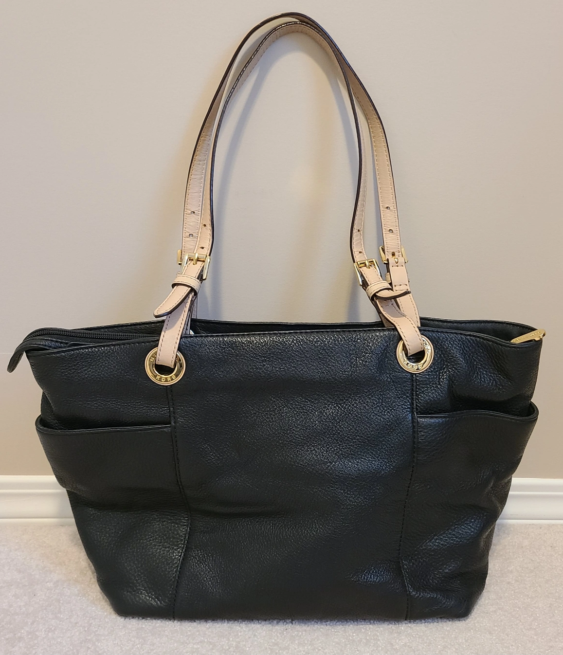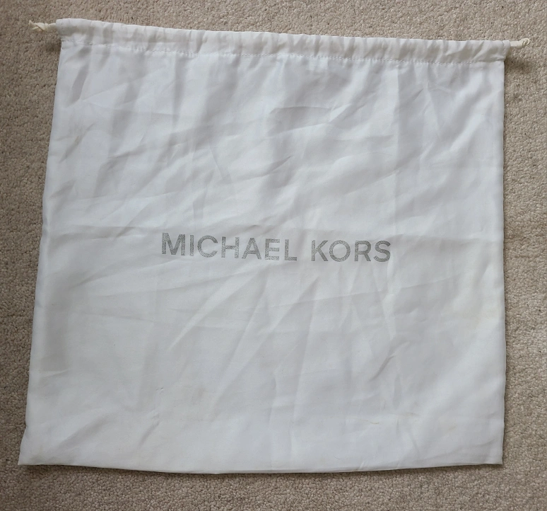 This is a black leather MK bag with beige straps and gold hardware. There are two open pockets on the outside; and inside there are 4 open pockets, 1 zipper pocket plus a key chain. It's in great condition and comes with original dust bag.