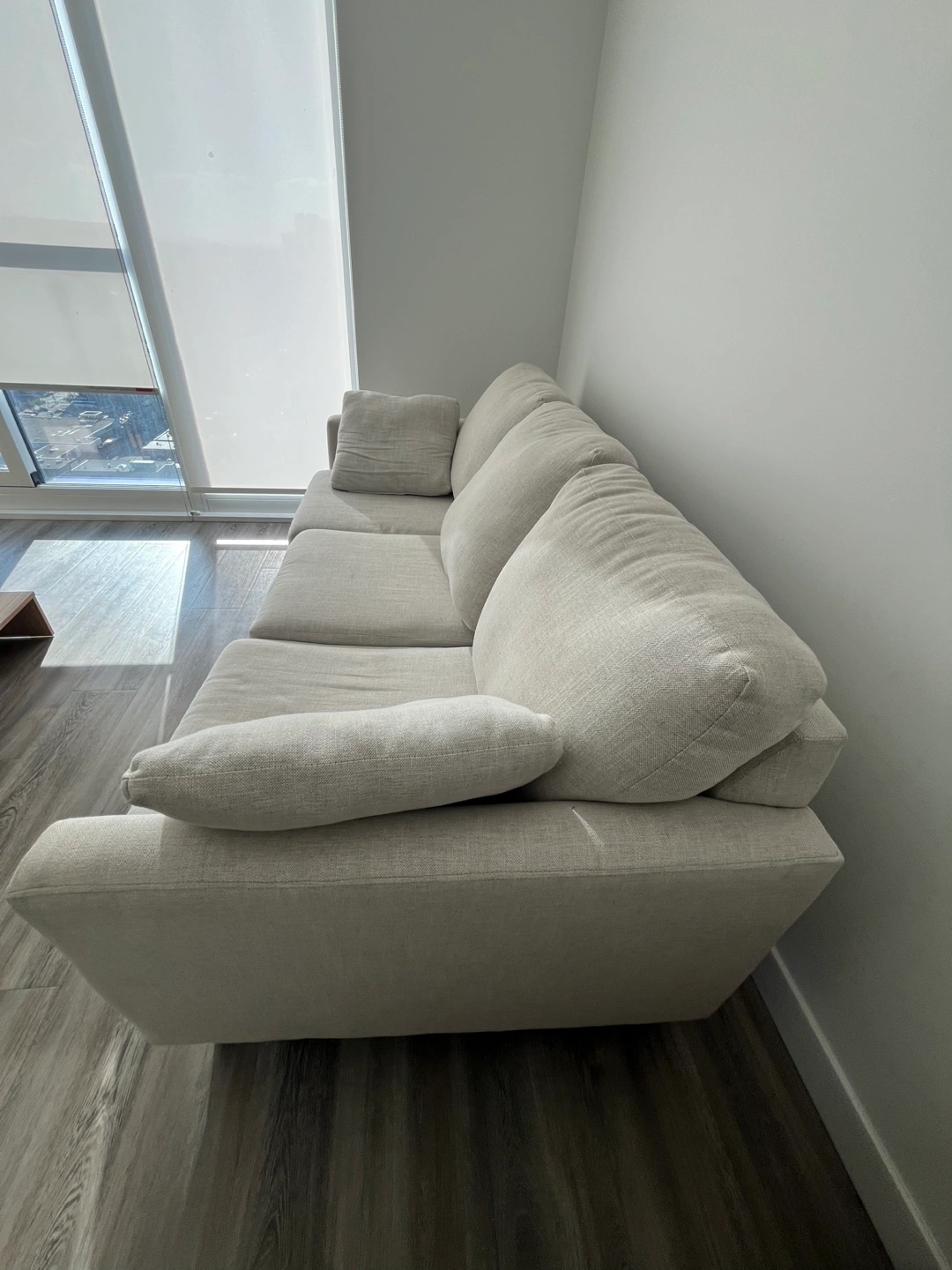Selling a super comfy Article Moda sofa in a light grey colour. It's in great condition and would be perfect for a living room or den. The material is soft and durable, and it's a great couch for lounging!