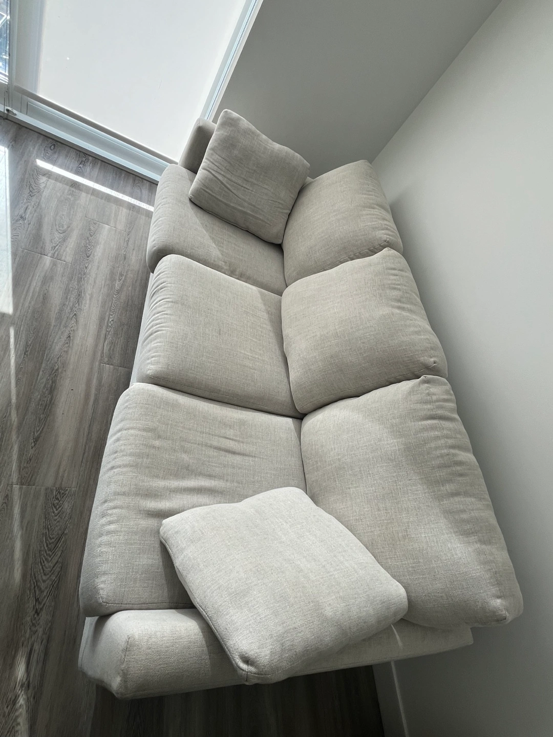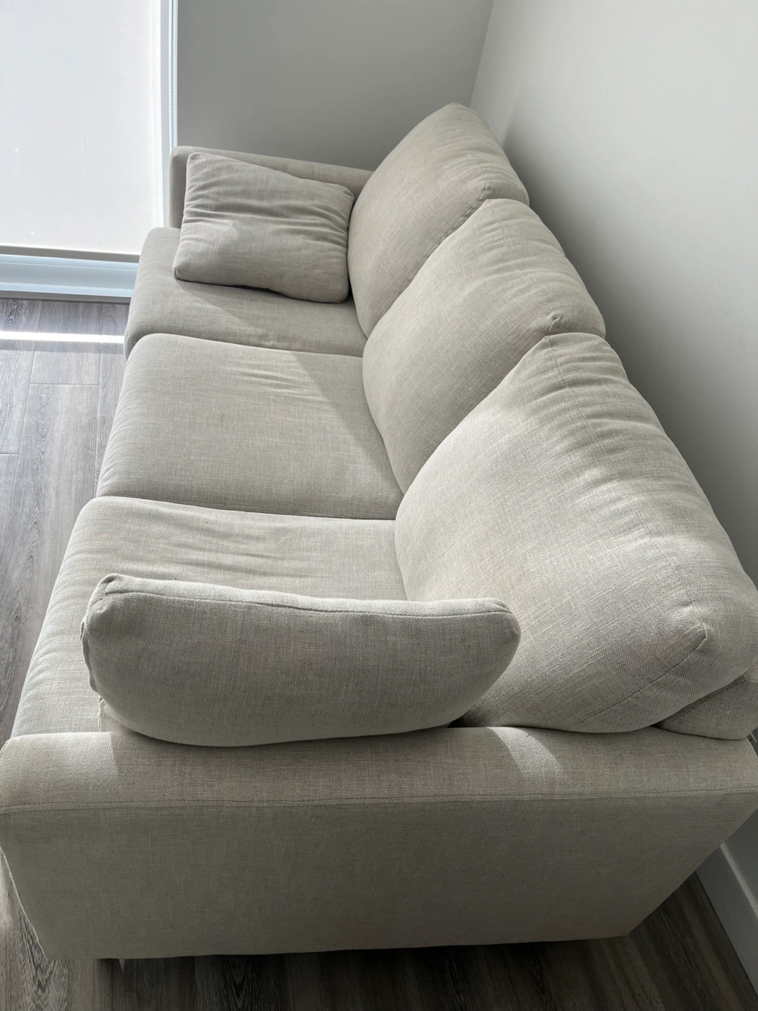 Selling a super comfy Article Moda sofa in a light grey colour. It's in great condition and would be perfect for a living room or den. The material is soft and durable, and it's a great couch for lounging!