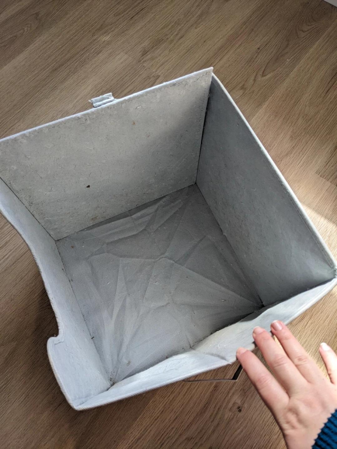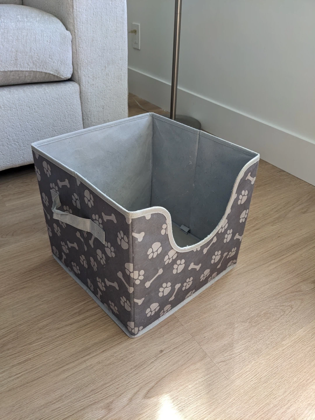 Collapsible storage bin. Or can be made into a small bed for kittens with some added cushion. Needs a little TLC but otherwise is sturdy and has handles on both sides for carrying/picking up.