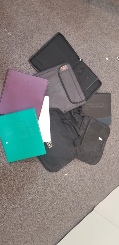 Free a mixed lot of binders and portfolio cases. There are various colours of binders and black portfolio cases. Good for students or anyone needing to organize documents!
