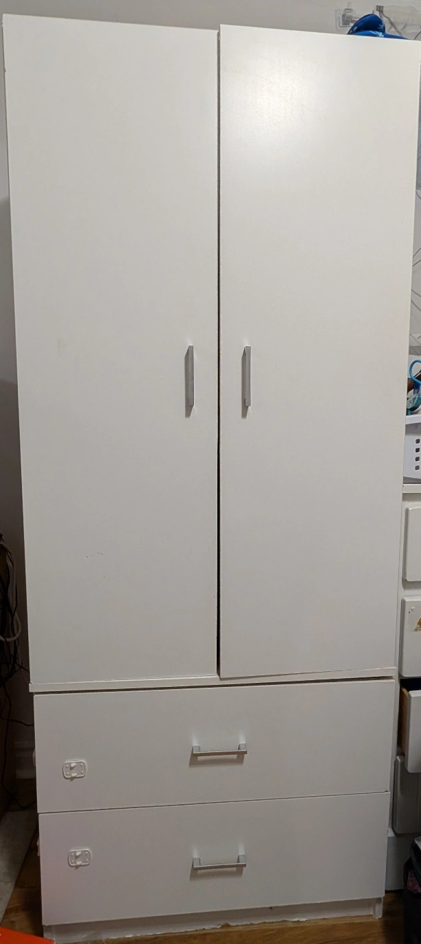 Selling a white wardrobe that has two doors and two drawers. It's perfect for a kids room or extra storage space. It's in great condition and ready for a new home!