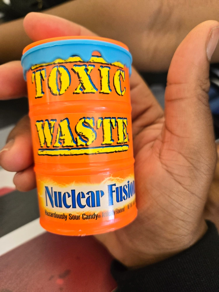 74Selling a container of Toxic Waste Nuclear Fusion Hazardously Sour Candy. It's an orange barrel with a blue lid. Great for a sour candy lover!