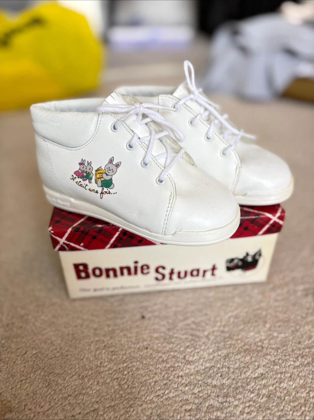 Adorable Bonnie Stuart baby shoes in white leather! They come with the original box. Perfect for your little one's first steps or as a keepsake