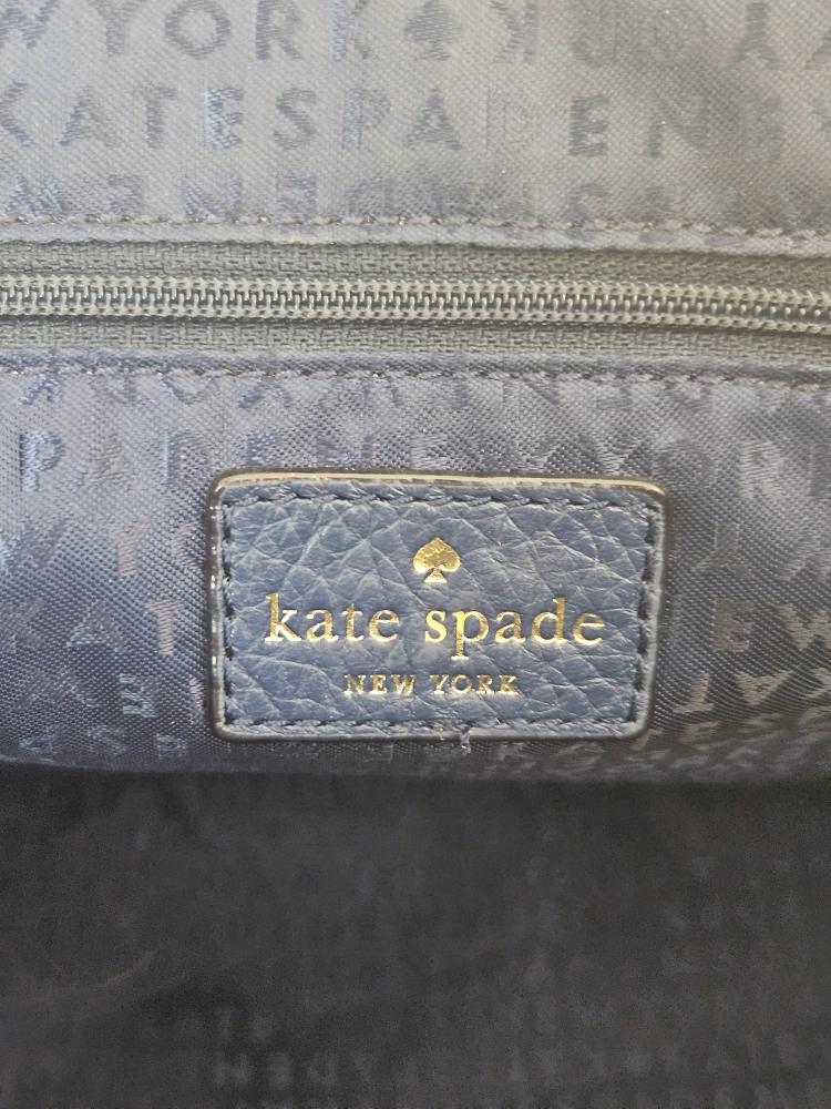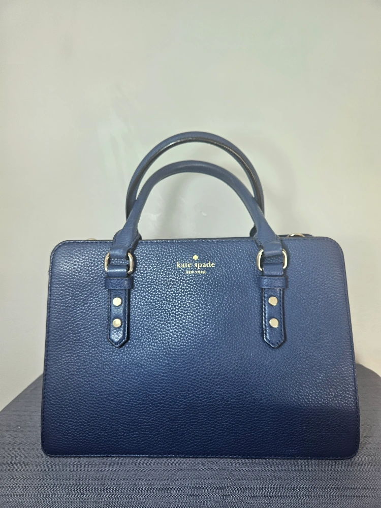 A beautiful Kate Spade satchel in a lovely shade of navy blue! It's made of leather and is in great condition with minimal wear and tear. Perfect for adding a touch of class to any outfit