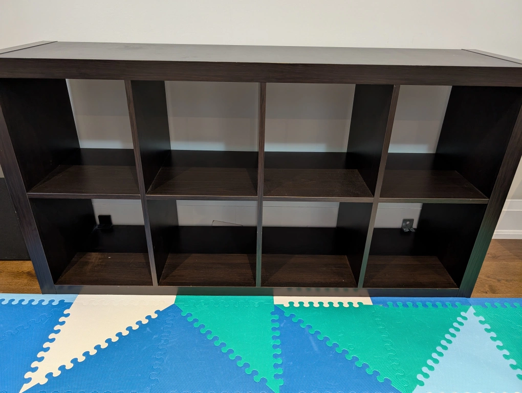 Selling a dark brown cube organizer shelf. It has 8 cubes for storage or display. Great for organizing books, toys, or decor in any room of your home