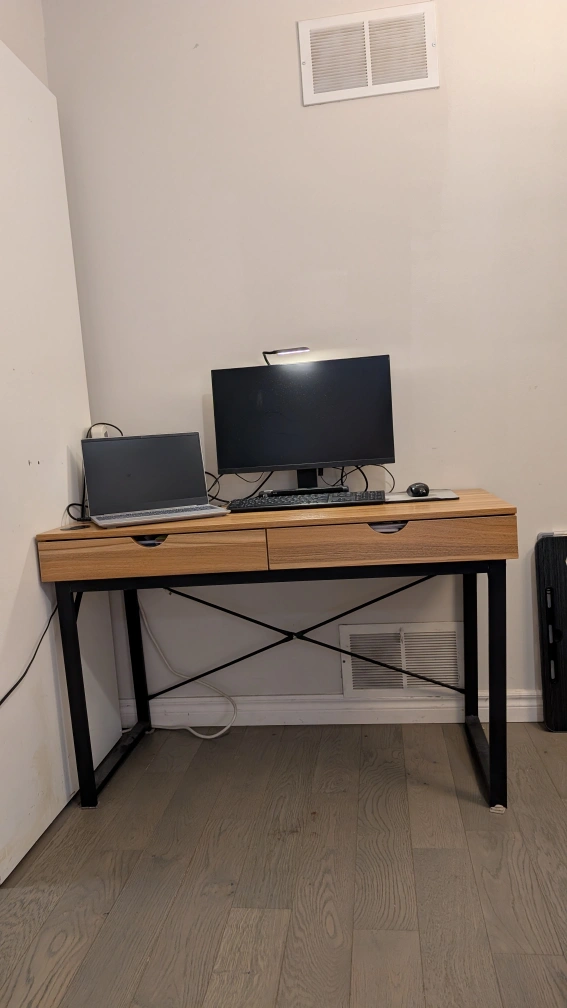 Selling a desk with a wood top and black metal legs. It has two drawers for storage, perfect for a home office or study space