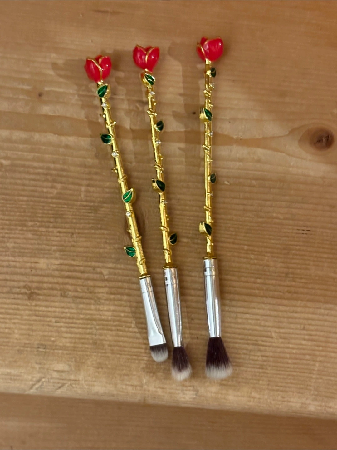 a set of three makeup brushes with a unique rose design. The handles are gold with green leaves and a red rose at the top. The brushes themselves are in brand new never used and ready to use!